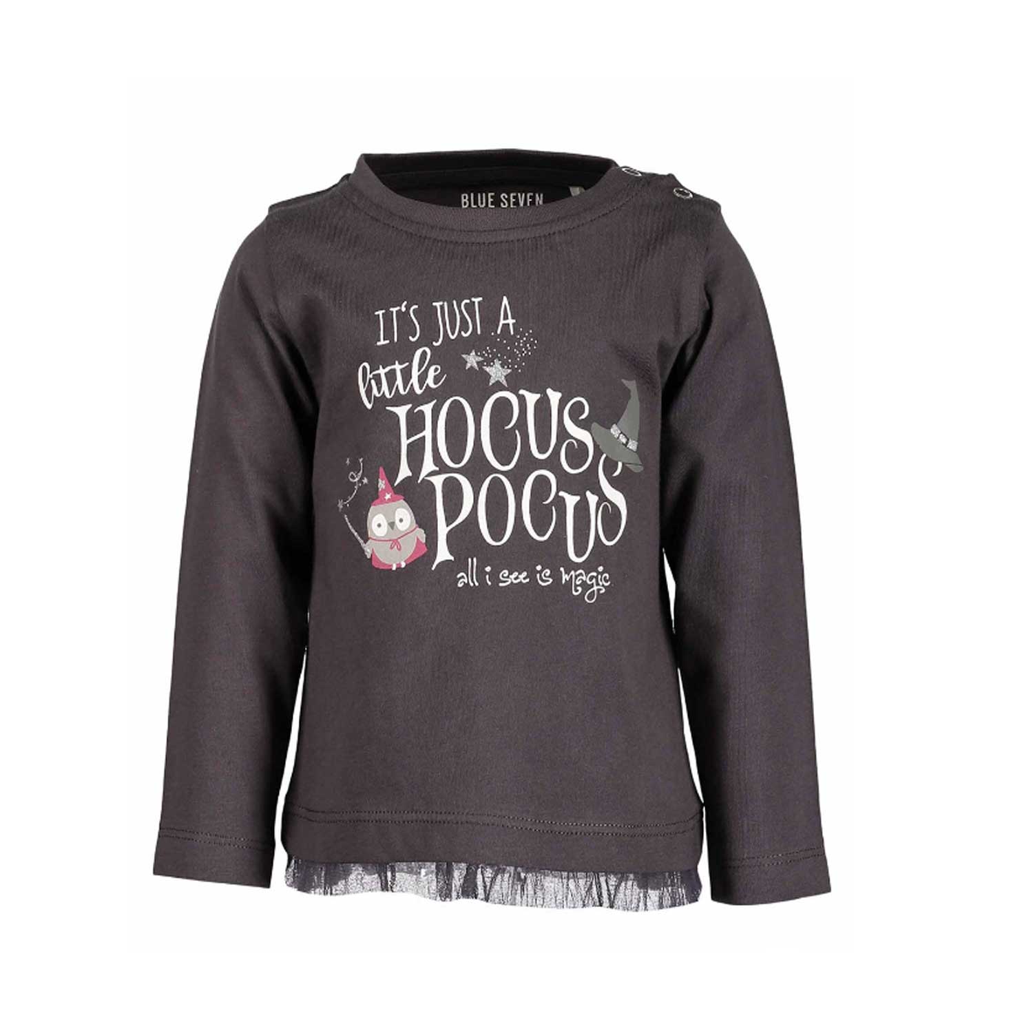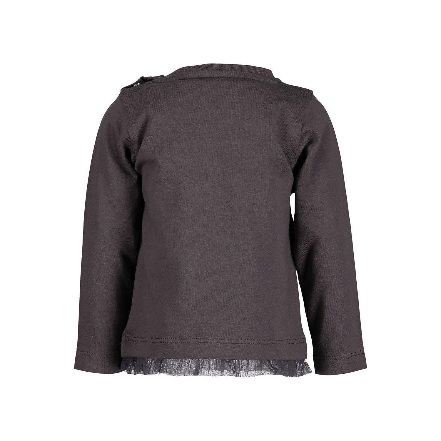 Blue Seven - Brown Long Sleeved T-Shirt Baby Girl Long sleeved t-shirt for baby girl, pattern drawn on the front, small canvas skirt at the waist and button closure on the left shoulder.