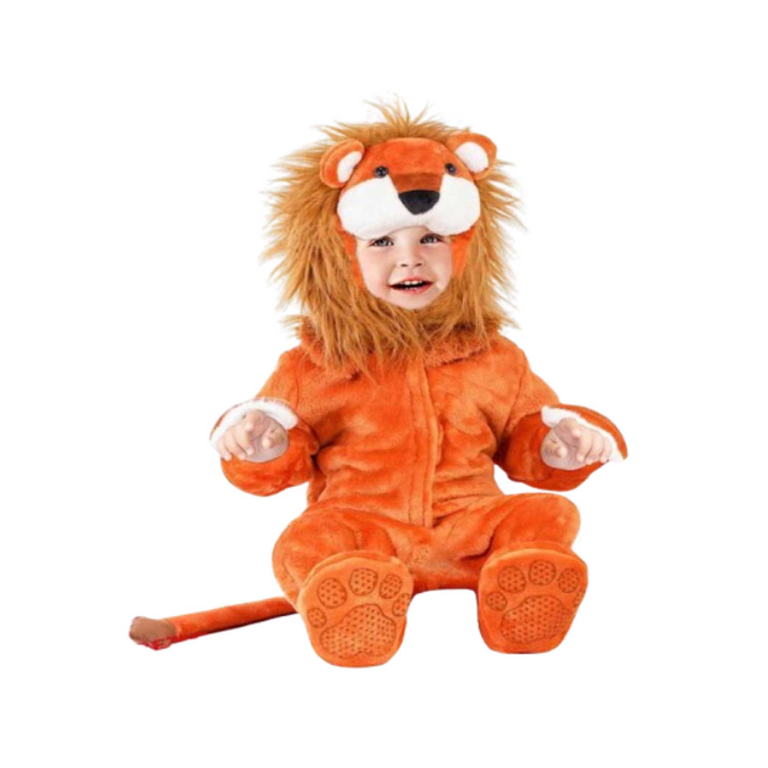Realizzato in morbida pelliccia beige, questo adorabile costume include una tutina con coda e copricapo a forma di testa di leone. La chiusura in velcro sulla parte anteriore e la cerniera lampo all'interno della gamba permettono un cambio veloce e pratico.