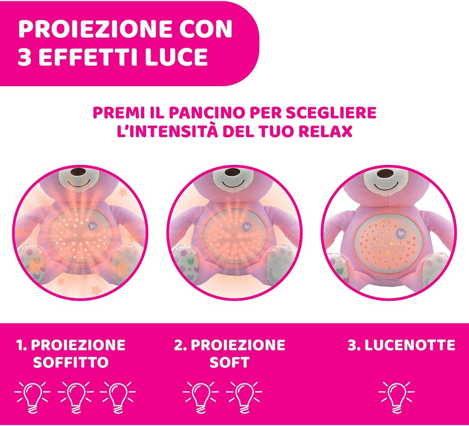 - 3 LIGHTING EFFECTS: The Chicco Baby Bear puppet is equipped with 3 light effects for different levels of relaxation: night projection with magical atmosphere; soft relaxing projection; night light to reassure the child