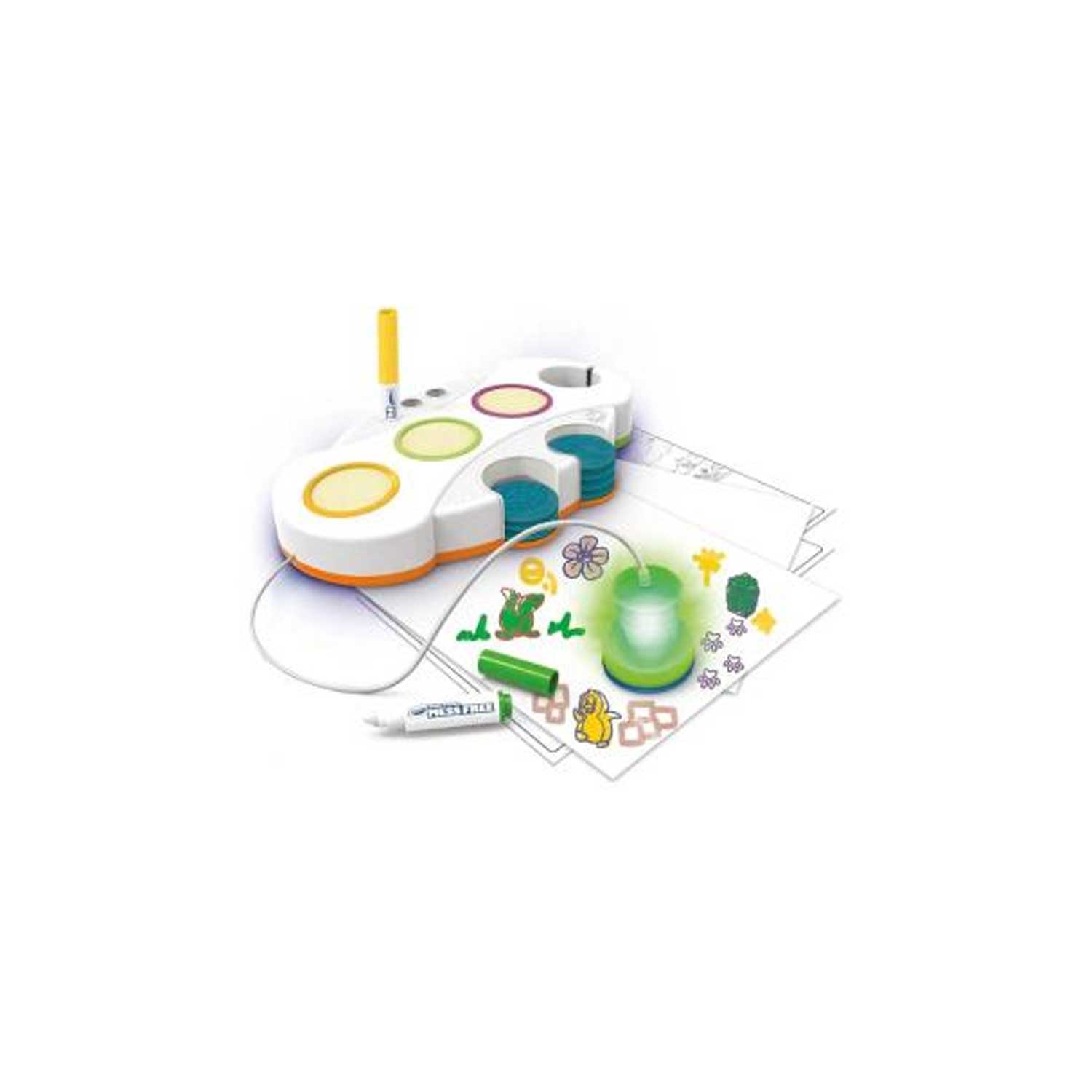 - Set stampini luminosi a tema marino include 10 stampini con personaggi e elementi del mare, 3 tamponi di inchiostro colorati, 3 pennarelli Color Wonder, 12 fogli e un’unità luminosa con manopola che si illumina nel colore scelto. Facile e divertente da usare basta posizionare il timbrino sotto la manopola, intingerlo nell’inchiostro e stampare; la luce colorata aggiunge un tocco magico alla creazione.