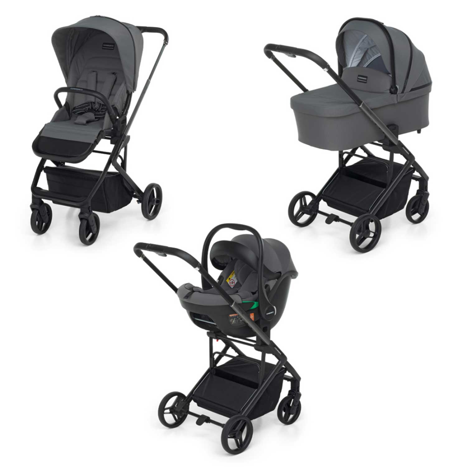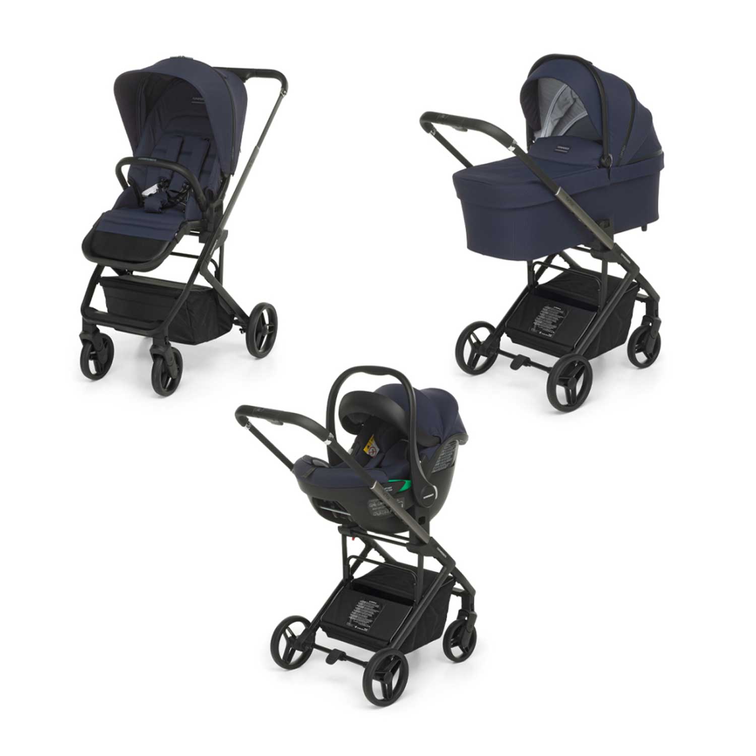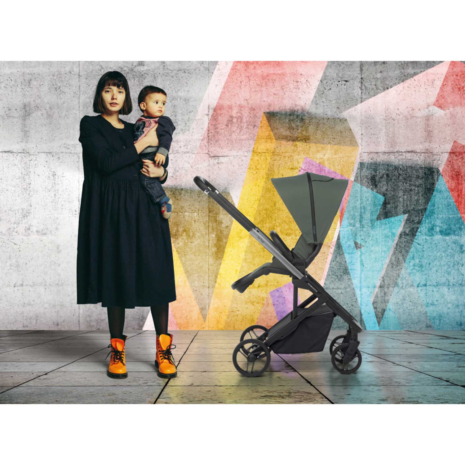 Telaio leggero in alluminio Self Standing con dettagli cromati possono essere montati la navicella spaziosa, interno sfoderabile e pieghevole per chiusura compatta, poi la seduta passeggino reversibile e chiudibile fronte strada e fronte mamma con schienale areato, utilizzabile fin dalla nascita, e il seggiolino auto i-Size per i primi mesi. Maniglione telescopico regolabile.