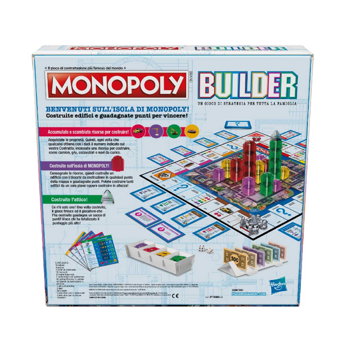 It is the Monopoly game, but with a different twist given by the Monopoly Island placed in the center of the board. With the Monopoly Builder strategy game, players move around the board buying properties and collecting rent and resources. Plus, use the building blocks to build a city on the island! The more a player builds, the more points he earns. The game ends when the penthouse is built. The player with the most points at the end of the game wins! The board game is designed for 2-4 players aged 8 and up and is a very fun game.
