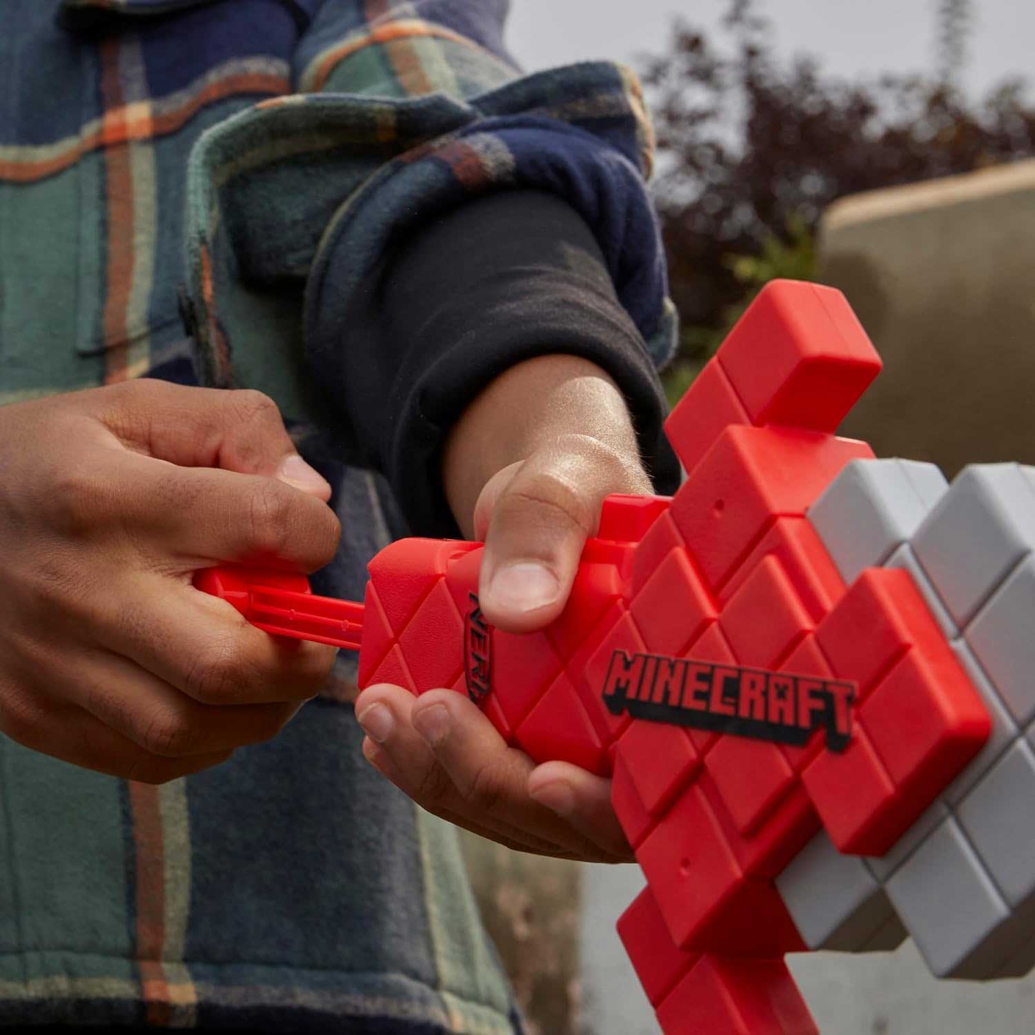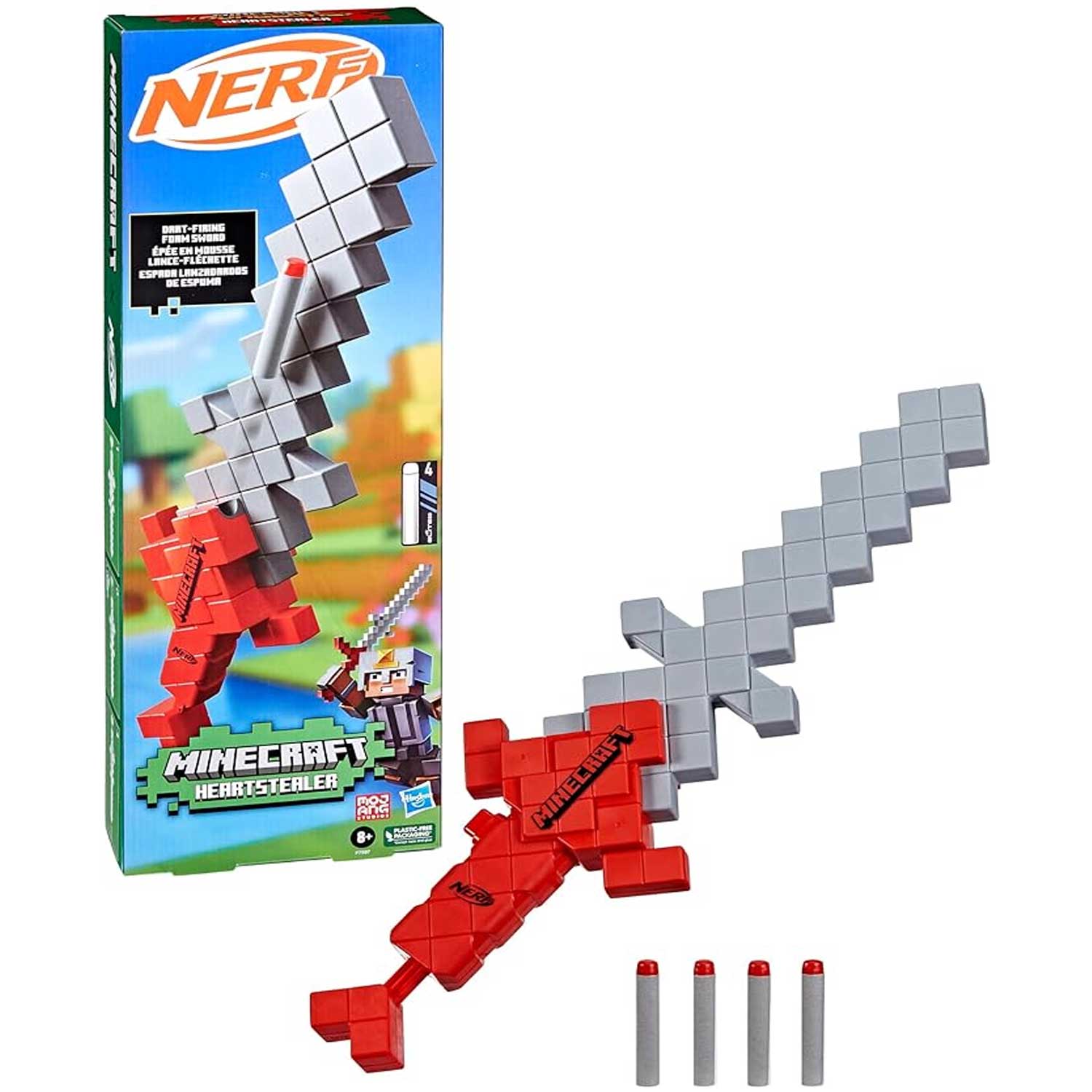 Nerf and Minecraft come together to create amazing blasters that change the face of battle! The Hearstealer sword, directly from Minecraft Dungeons, is 50cm long. From the foam blade launches a dart thanks to the practical rear charge. It is recommended to wear protective glasses (not included).