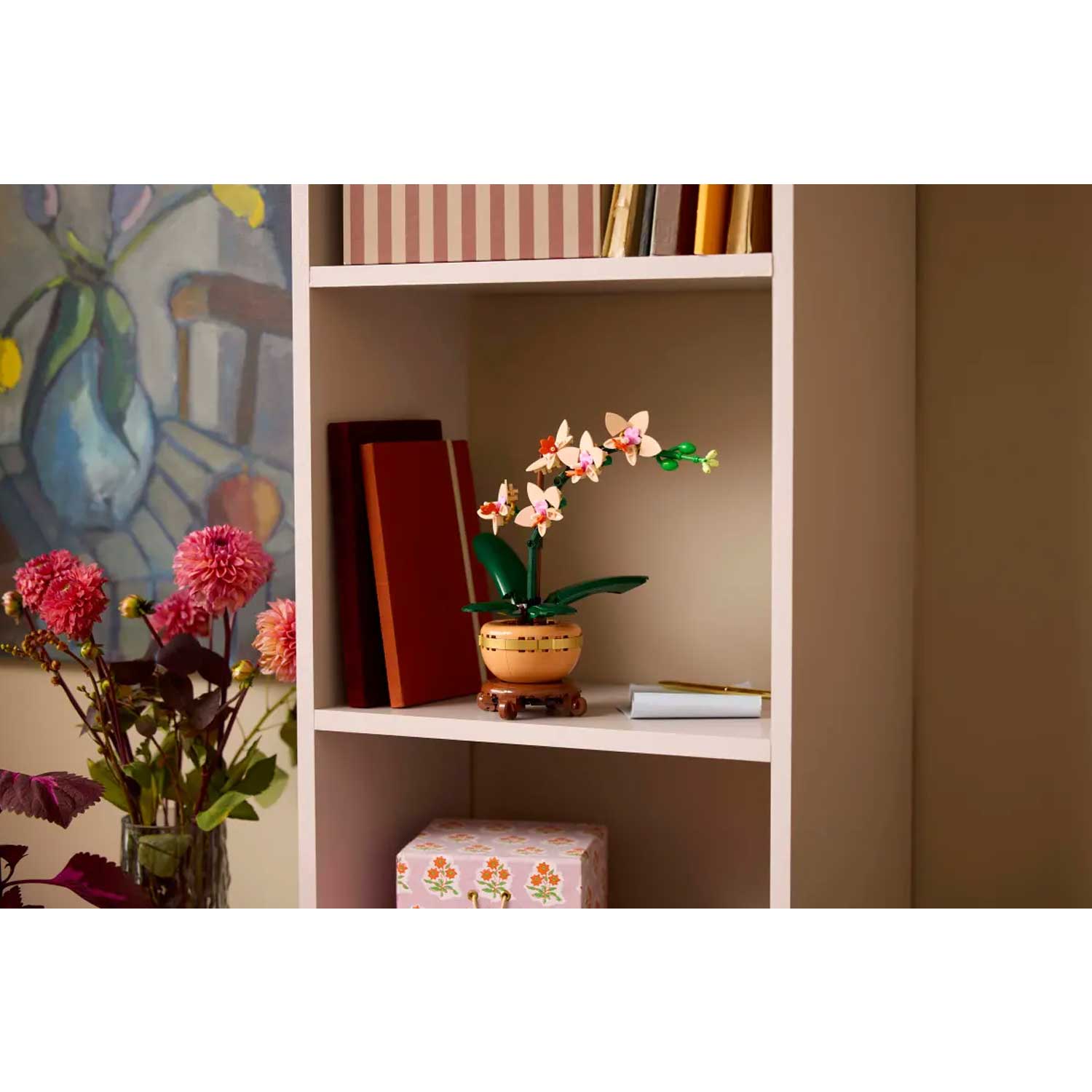 La replica realistica presenta 5 fiori di orchidea in fiore e alcuni in bocciolo, oltre a foglie per tanta autenticità in più. Contiene inoltre un vaso da fiori color pesca posizionato su uno splendido piedistallo effetto legno, facilitando l'esposizione del fiore LEGO da parte dei fioristi in erba che potranno così portare tanta tranquillità naturale in qualsiasi spazio di vita o di lavoro.