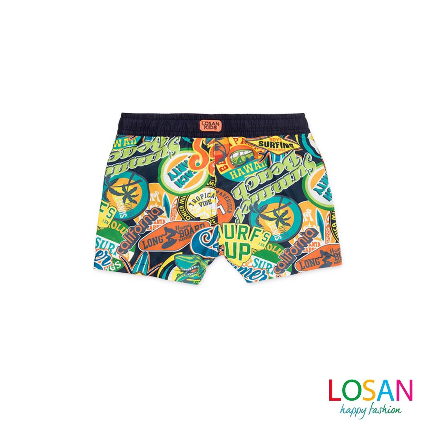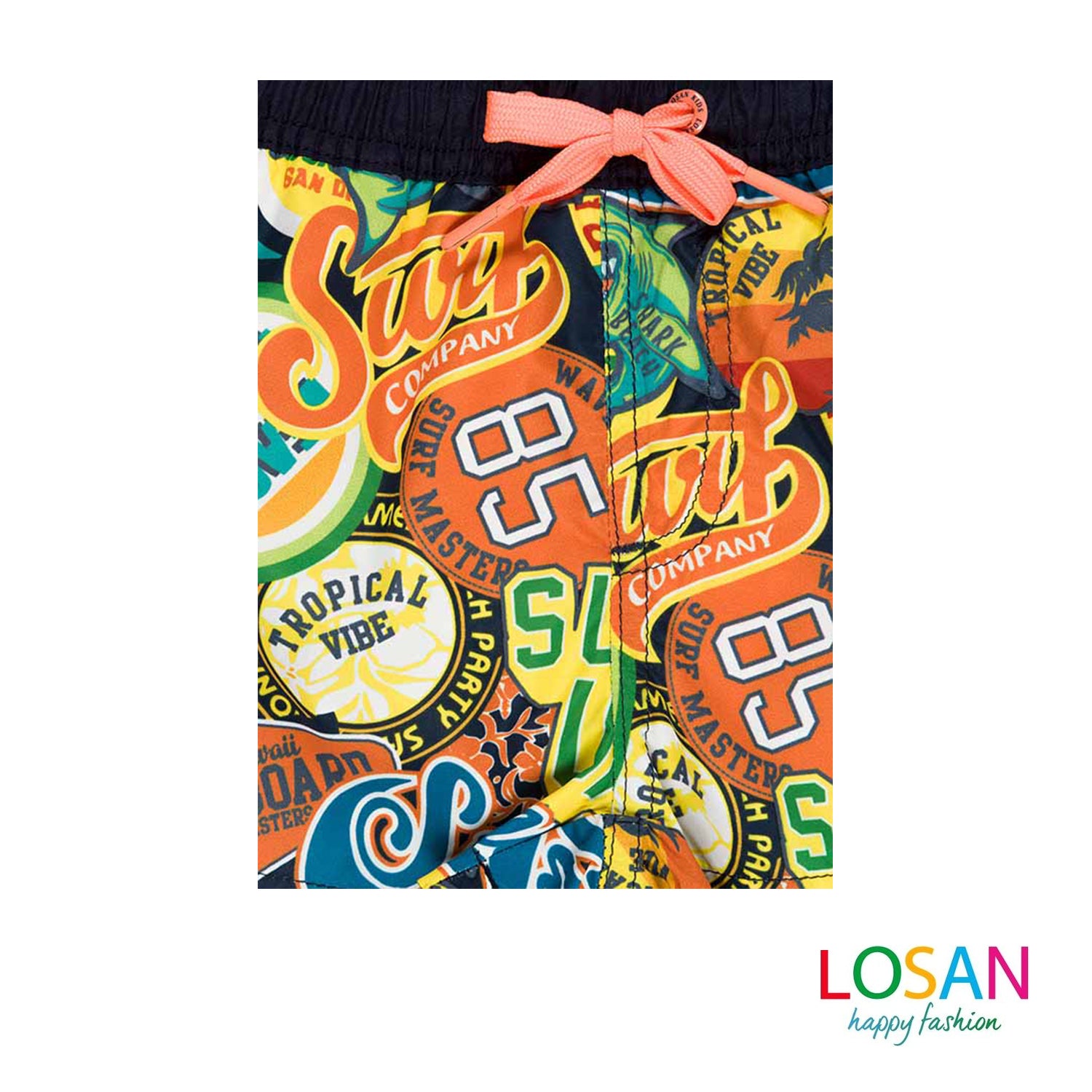 Swimsuit with surf print for boys. Blue microfiber swimsuit with elastic waist. Drawstring, false codpiece and side pockets. Lining in mesh fabric and rubber label on the back personalized by the Losan brand.
