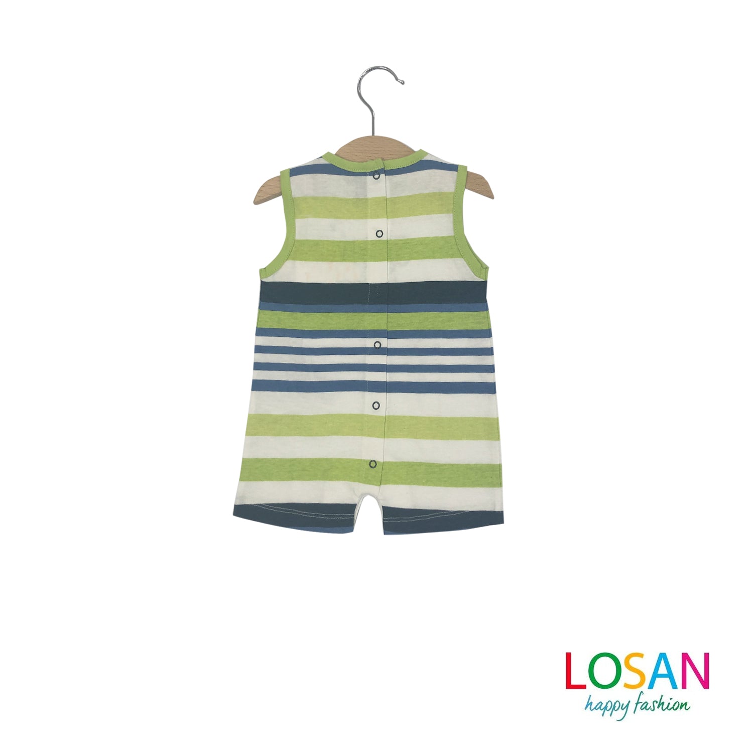 Blue, pistachio and white striped romper for baby boy, with decorative text printed on the chest.