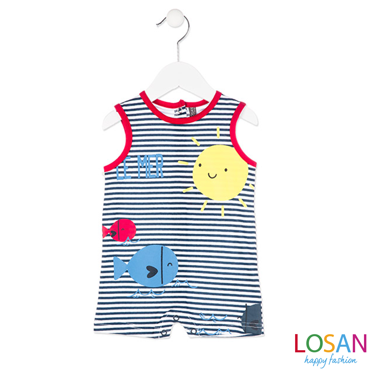 The Losan baby boy romper in marine color with 100% cotton striped patterns.