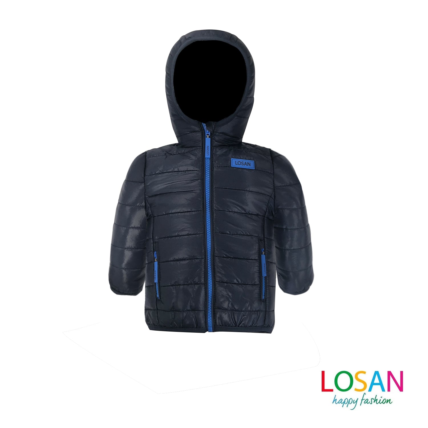 Lightweight down jacket with hood and pockets. Rubber logo and contrasting zip, customized with the "Losan" brand.