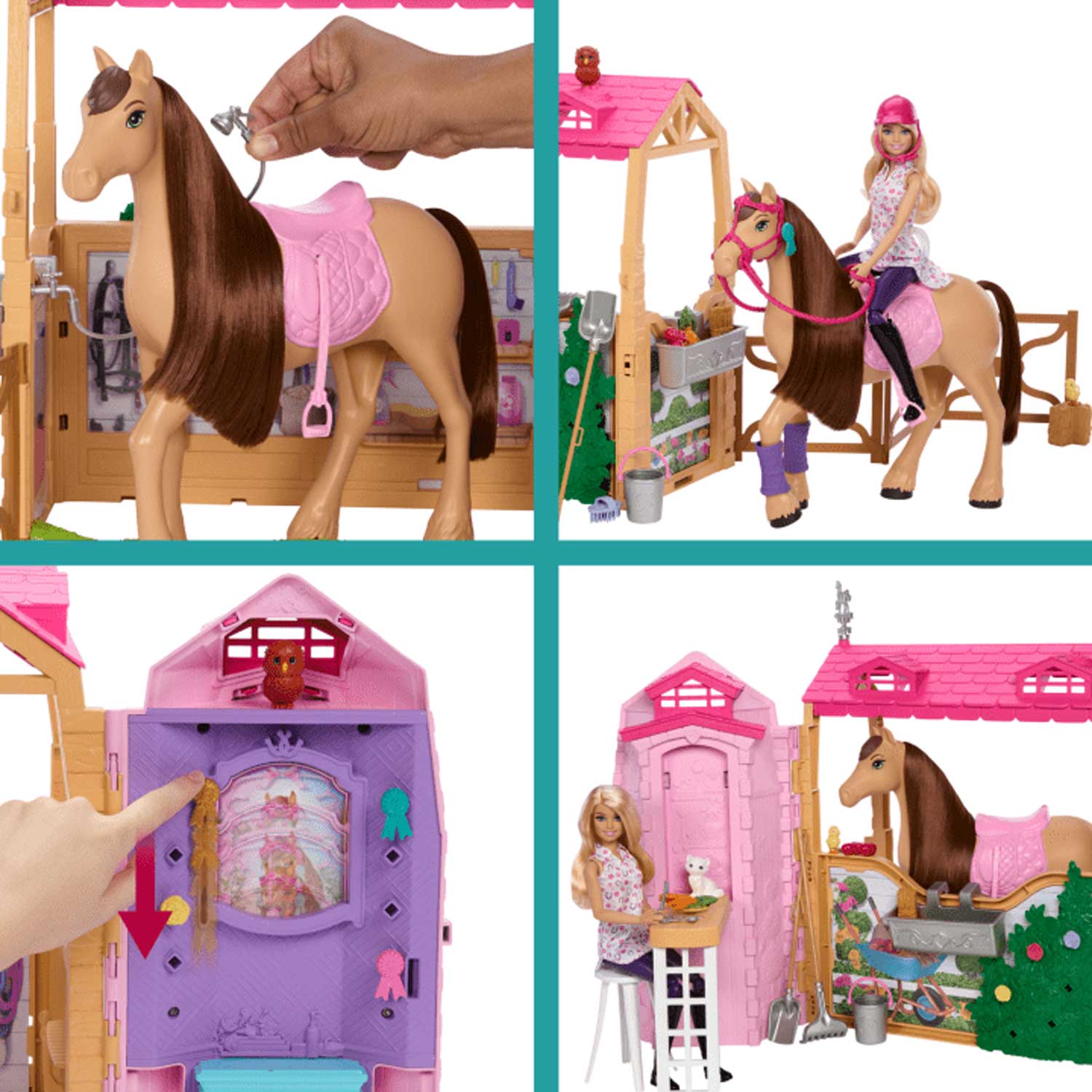 - Con sei aree di gioco, i bambini possono aiutare Barbie a prendersi del suo cavallo giocattolo con squisite verdure da mangiare alla stazione di alimentazione, a pulire e spazzolare il cavallo nell'area della toeletta, ad allenarsi alla staccionata da salto, ad appendere nastri o a fare scorrere le foto sulla parete del trofeo.
