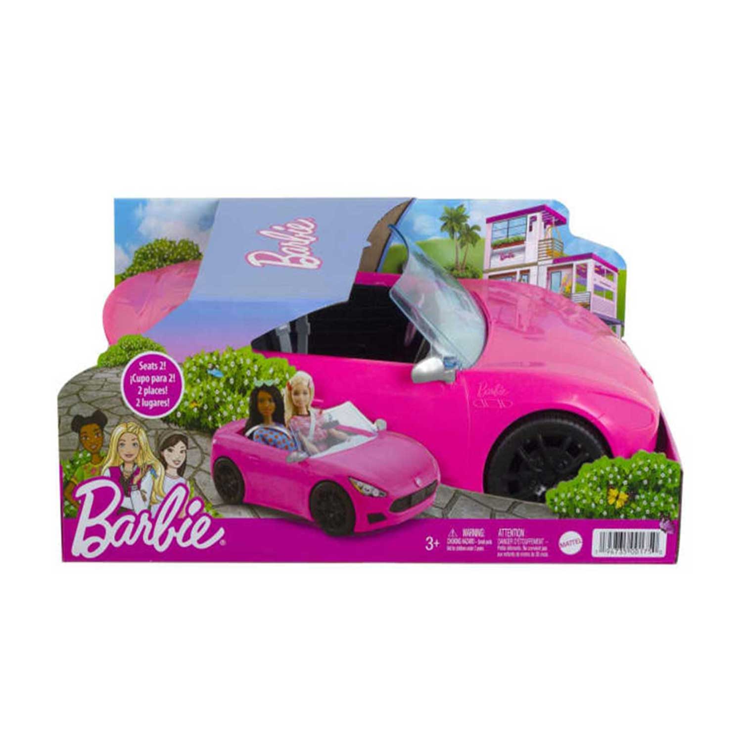 Barbie® pink convertible accompanies you on all your adventures! This stylish convertible car stimulates the imagination with a sleek design and modern finish. The convertible boasts a sporty silhouette, realistic details and signature Barbie® style, like the personalized license plate and Barbie® silhouette on the hood. With rolling wheels and room for two Barbie® dolls (sold separately), just buckle up and give the adventure a little push! Dolls sold separately. Colors and decorations may vary.