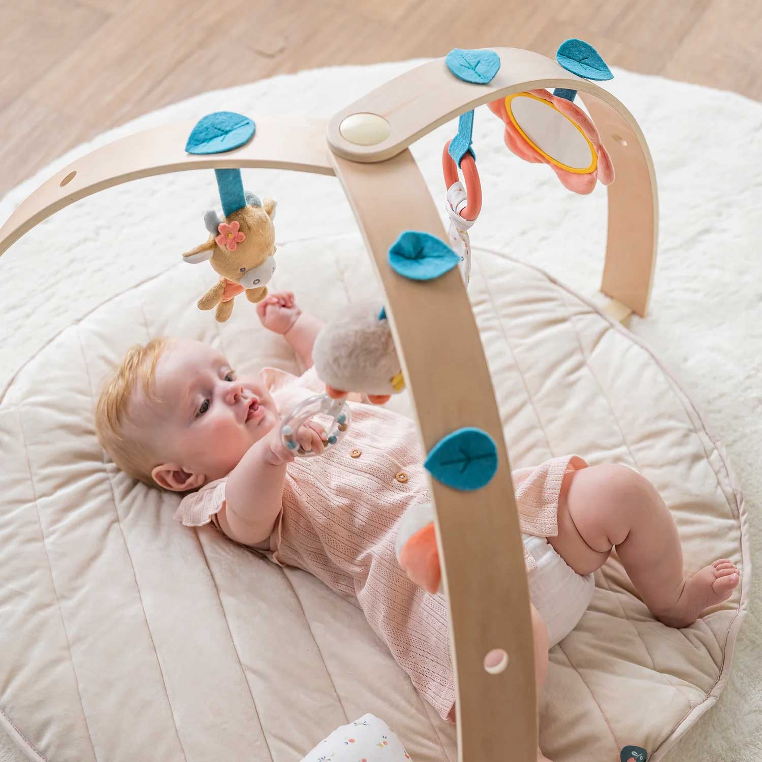Il tappetino da gioco Mila, Lana & Zoë è particolarmente morbido e soffice ed è dotato di un'imbottitura extra intorno al bordo per far stare comodi i più piccoli durante il gioco. Gli archi che lo accompagnano e il tappeto stesso offrono ogni tipo di attività da scoprire, da seduti, sdraiati o a gattoni. La carta scricchiolante, il sonaglio, lo specchio e altre attività risvegliano la curiosità e il senso di scoperta. Così i piccoli possono sentire, gattonare e afferrare nel loro piccolo mondo di giochi.