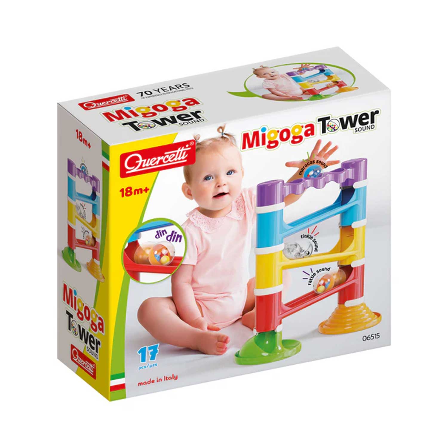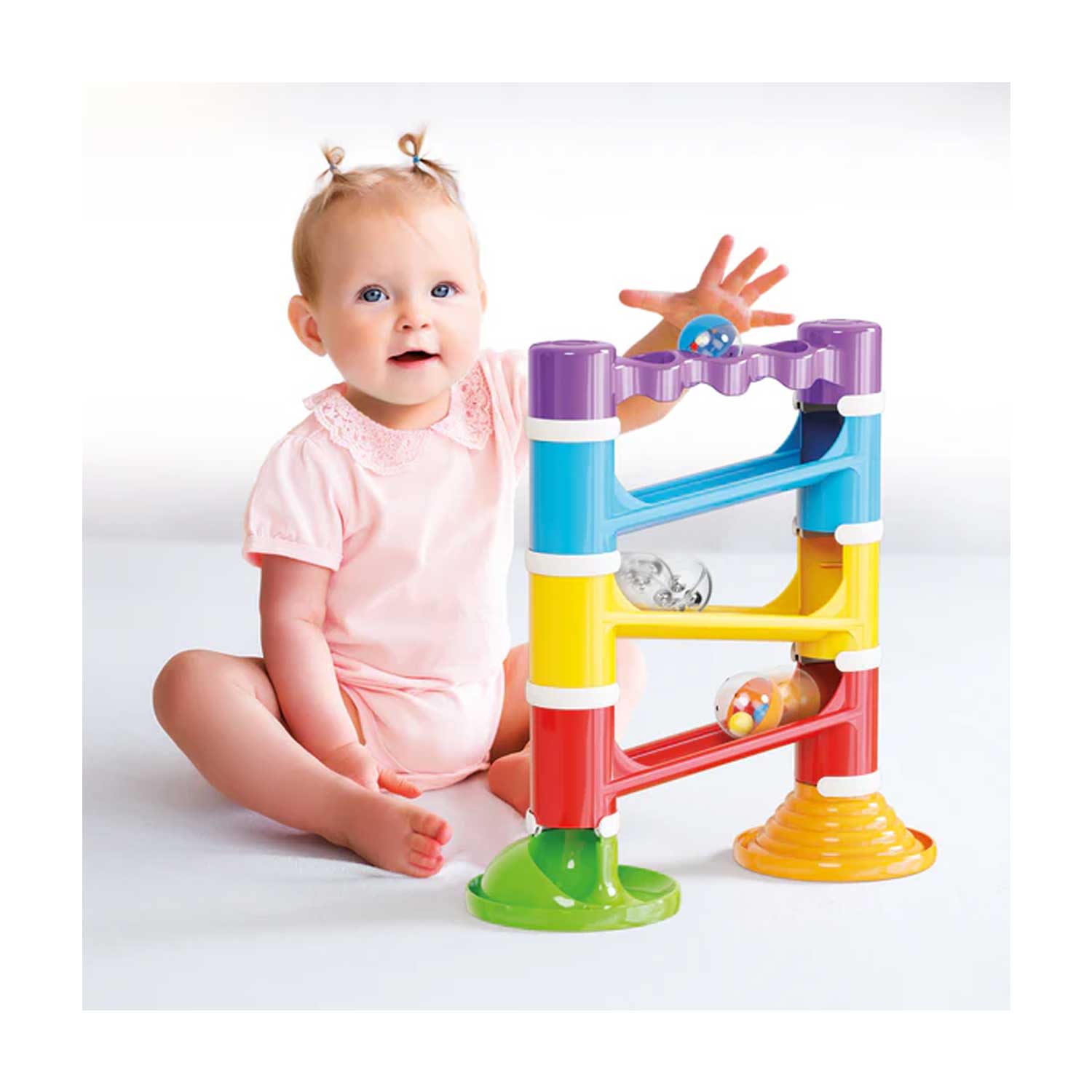 Vietato annoiarsi con questa pista piena di stimoli, ideale per i più piccolini! Ogni tappa è una sorpresa: percorsi pieni di curve lungo cui sfrecciano tre grandi biglie sonore, creando suoni unici a ogni passaggio. Le biglie producono 3 differenti suoni.