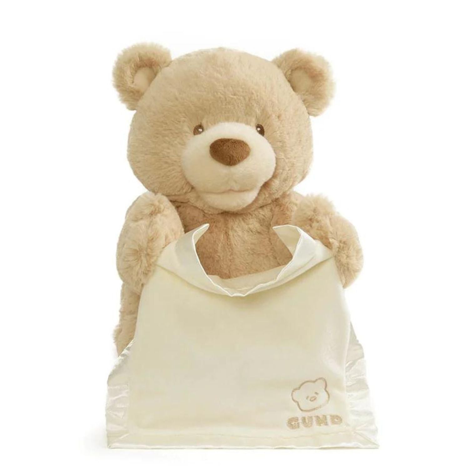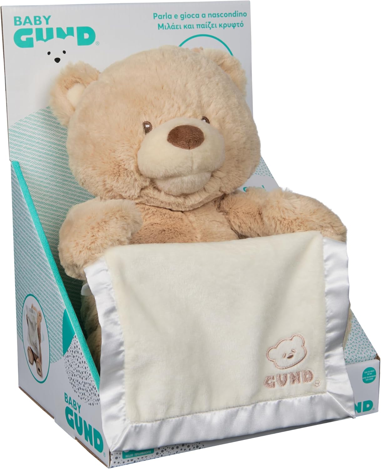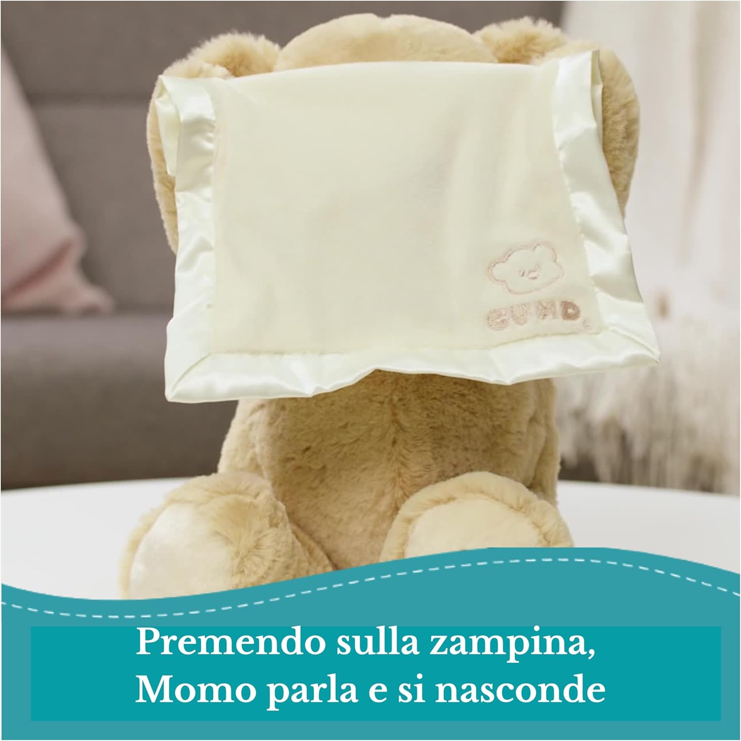 Momo is a teddy bear that moves its paws and, lifting its cover, plays hide and seek with the child. Thanks to the up and down movement of the soft cover over the eyes, Momo plays hide and seek, involving the baby and establishing a real interaction. It has a soft, high quality short fur, two cute ears and embroidered eyes to ensure total safety.