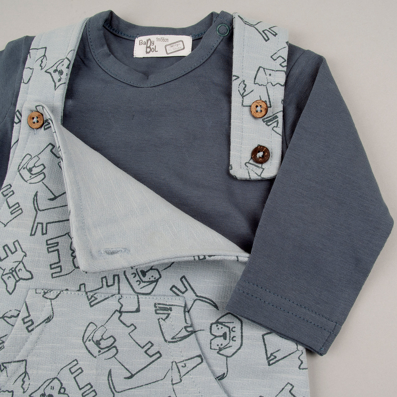 Composto da una simpatica salopette in cotone beige con dettagli a costine sul fondo gamba e bottoncini in legno effetto naturale, e da una morbida maglietta manica lunga con stampa cuccioli, questo set è l’ideale per le giornate fresche.