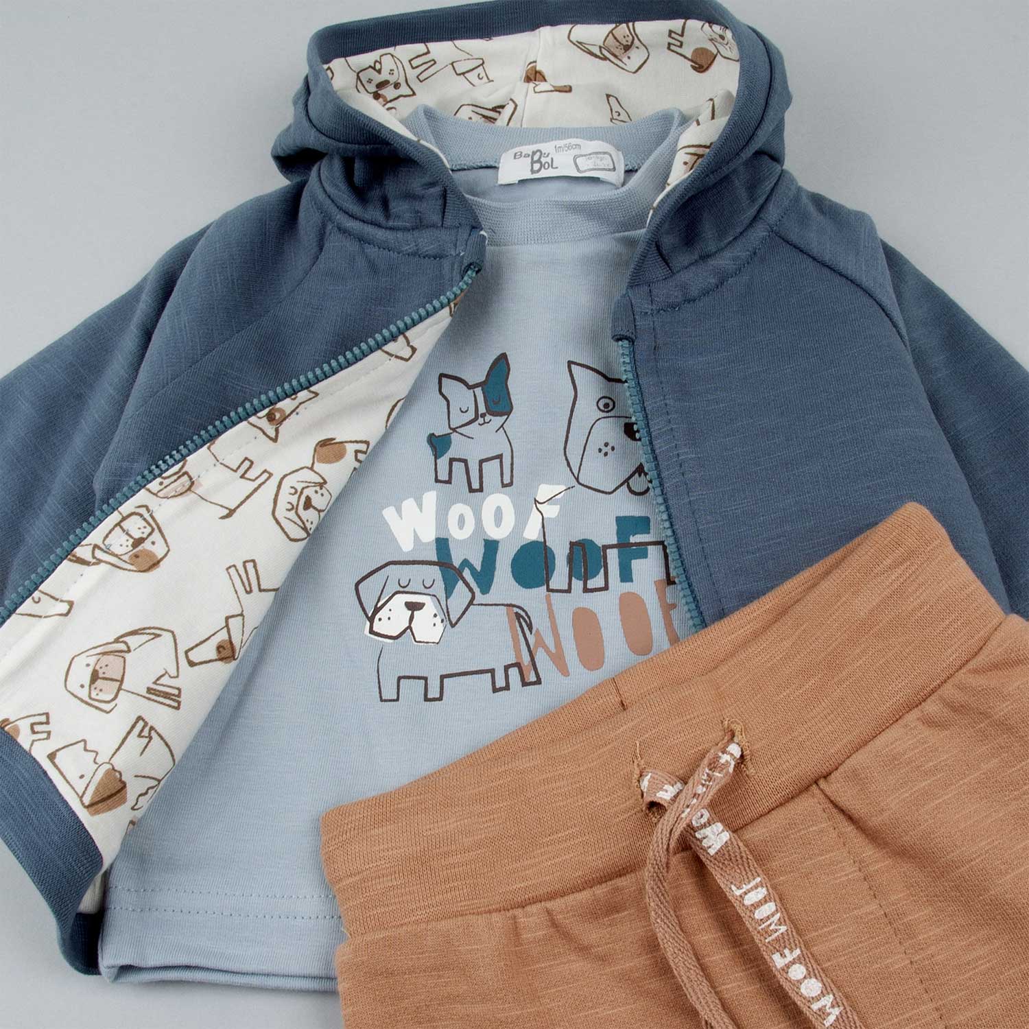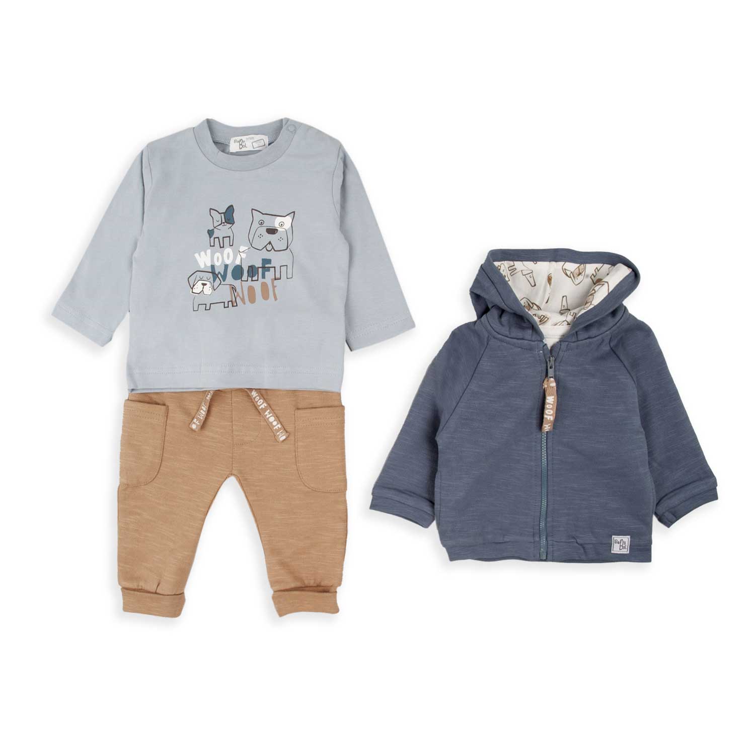 Il completo bimbo "Woof" da 3 pezzi è la scelta perfetta per vestire il tuo bambino in modo comodo e coordinato.