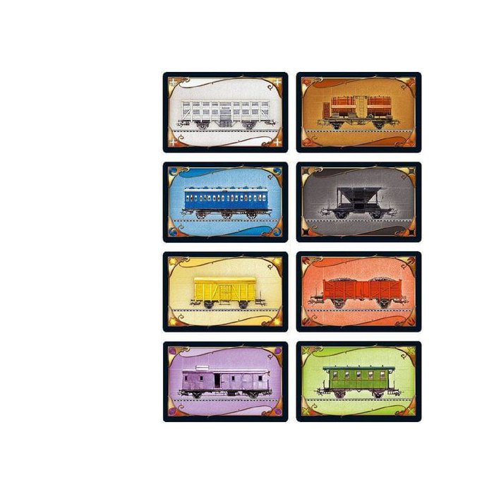 - Contenuto: 1 Mappa, 240 Vagoni Colorati, 144 Carte, 5 Segnapunti Legno e 1 Regolamento.