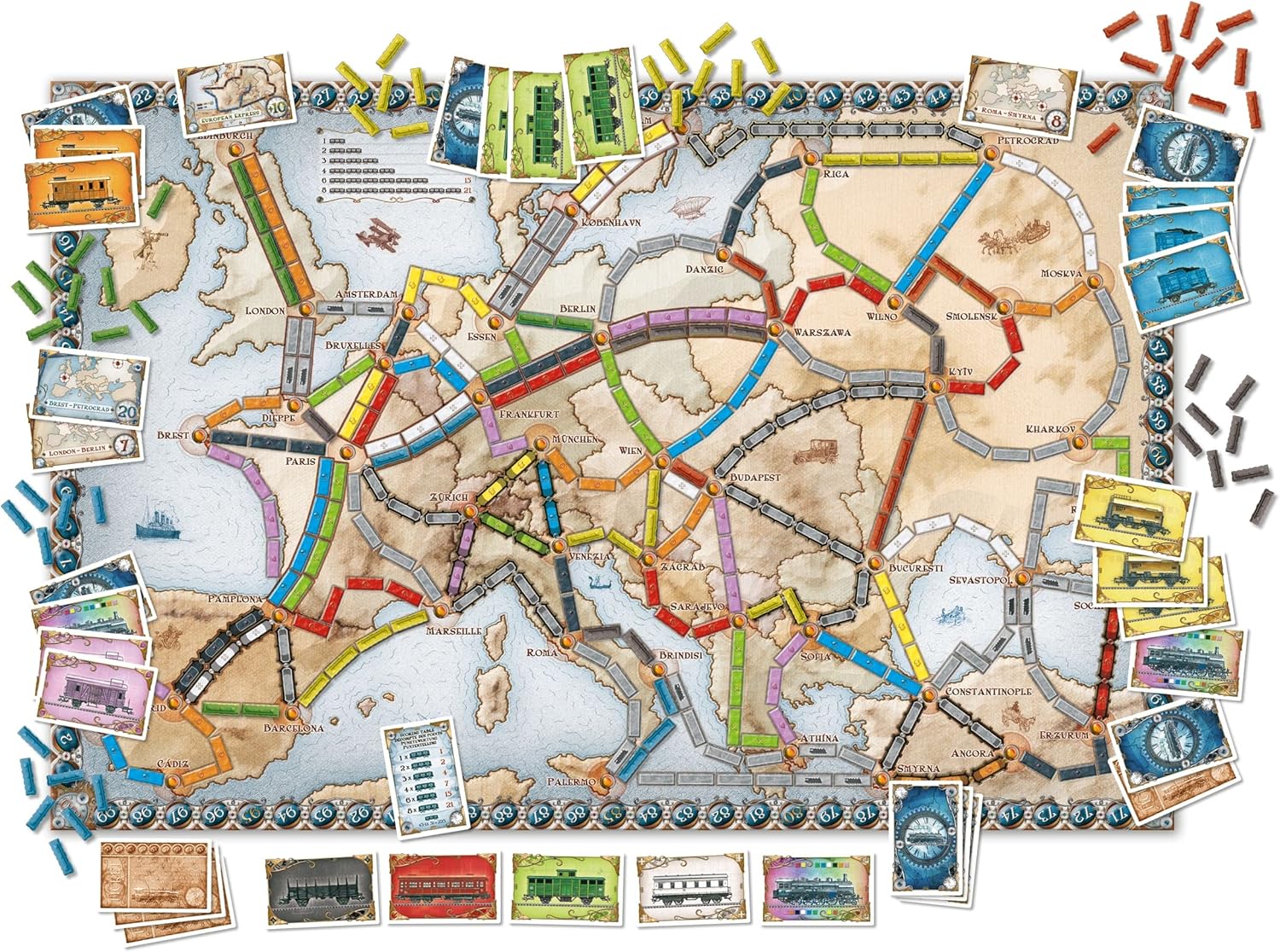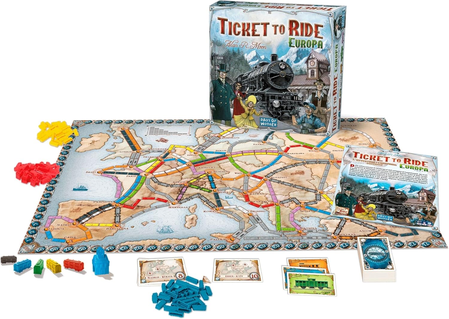 Ticket to Ride Europa aggiunge un nuovo capitolo alla nostra serie di avventure ferroviarie di grande successo. I giocatori accumulano carte di vari tipi di vagoni e le utilizzano per costruire stazioni, attraversare gallerie e viaggiare sui traghetti al fine di controllare le linee ferroviarie di tutta Europa. Ticket to Ride Europa è un gioco semplice ed elegante: sono sufficienti 5 minuti per imparare a giocare, ed è apprezzato sia dalle famiglie che dai giocatori più esperti.