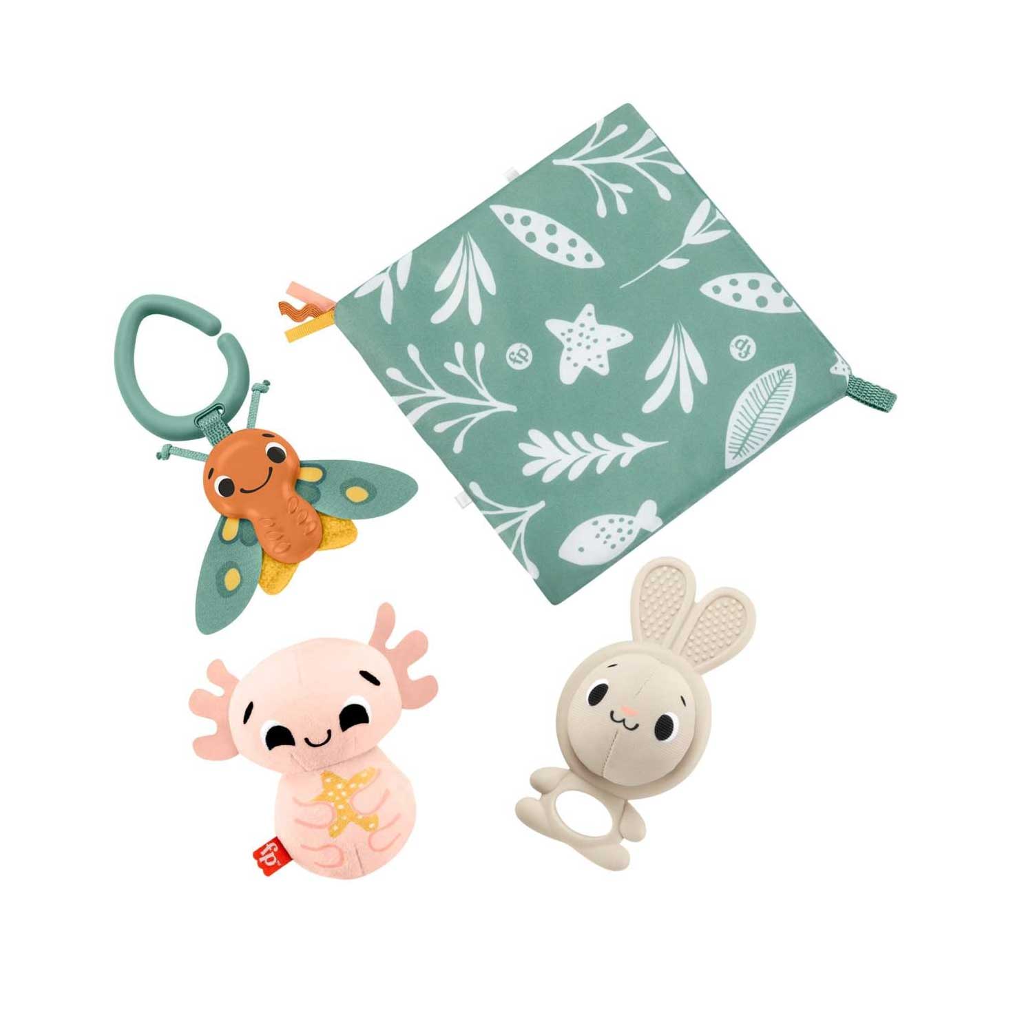 Questo set in include 4 giocattoli tra cui un dentaruolo senza BPA a forma di coniglietto con pallina tintinnante pop-out, un morbido axolotl tintinnante, un sonaglino testurizzato a forma di falena e un morbido pannello frusciante in tessuto con nastrini.
