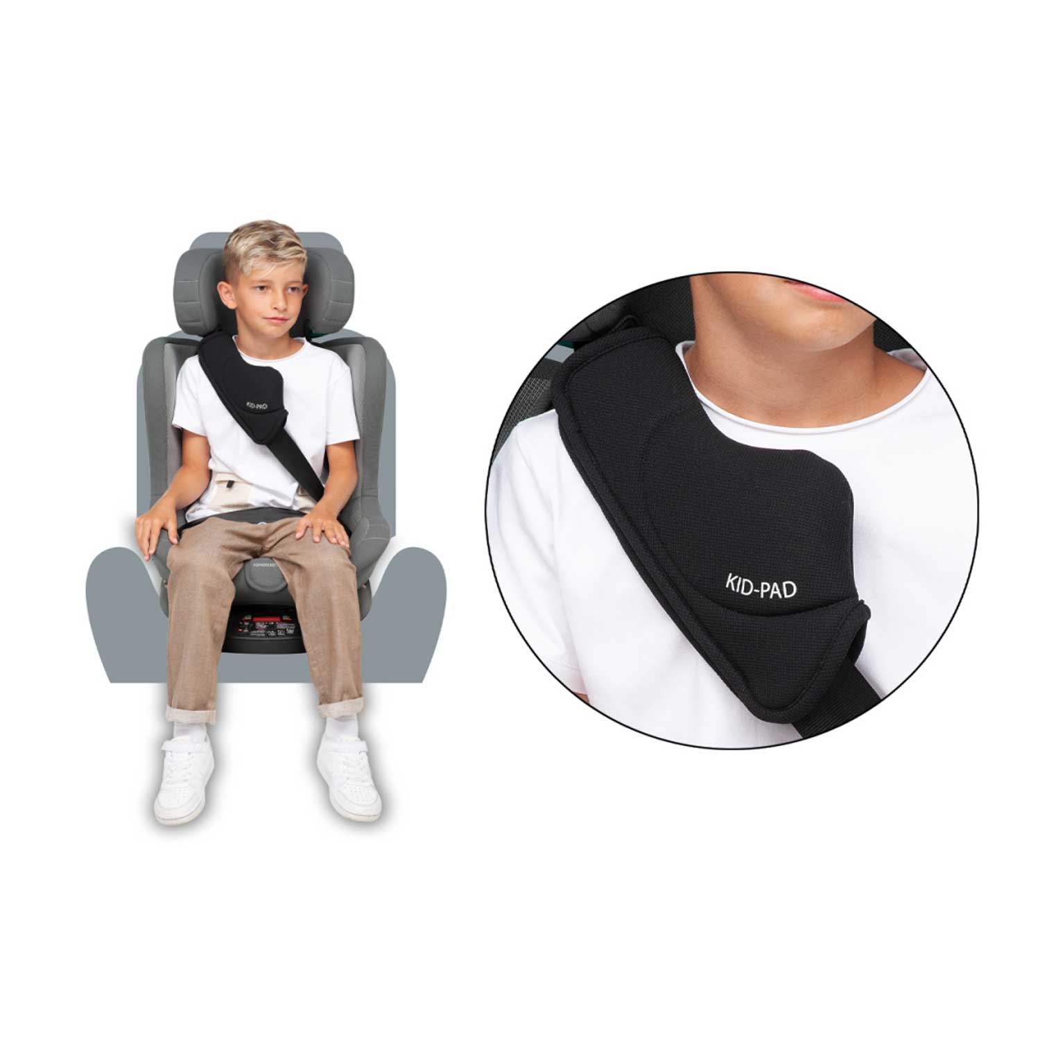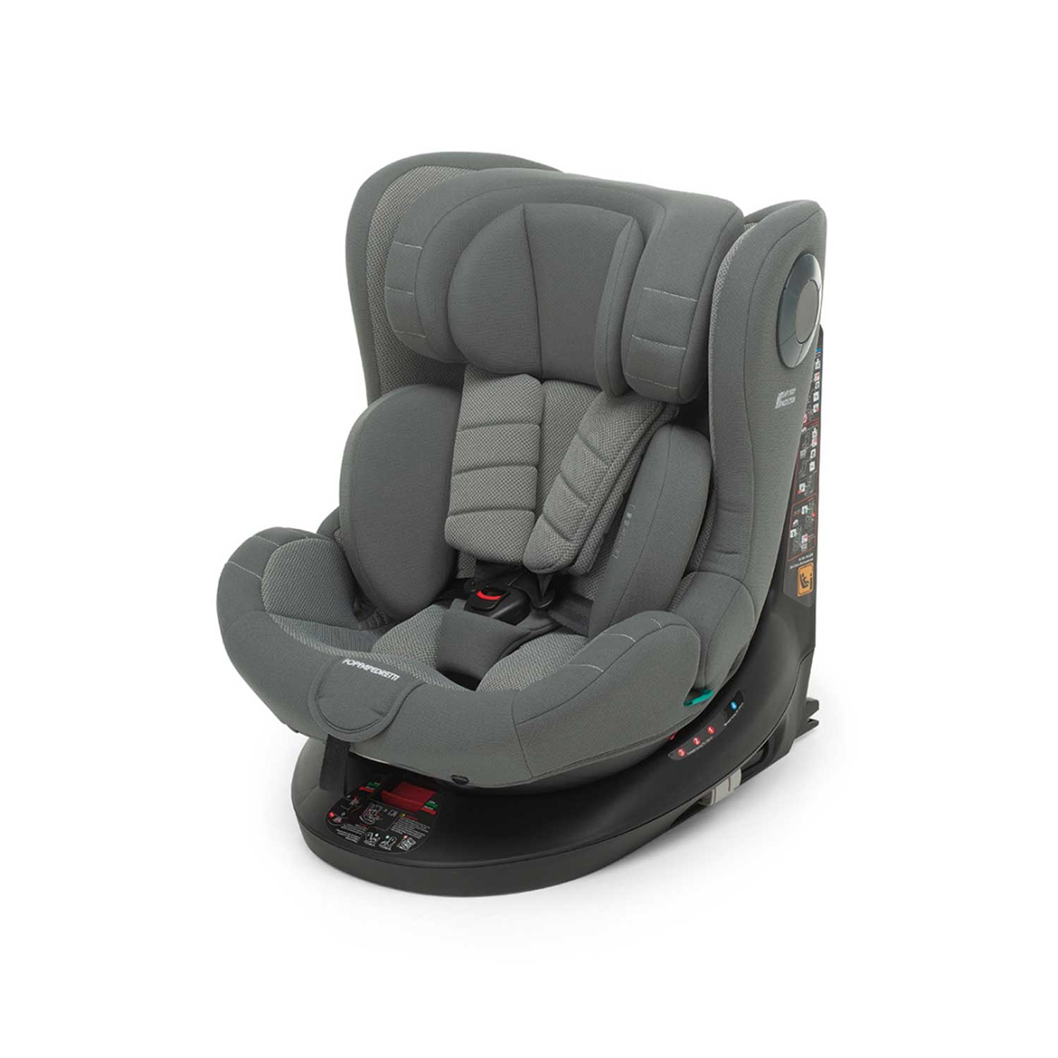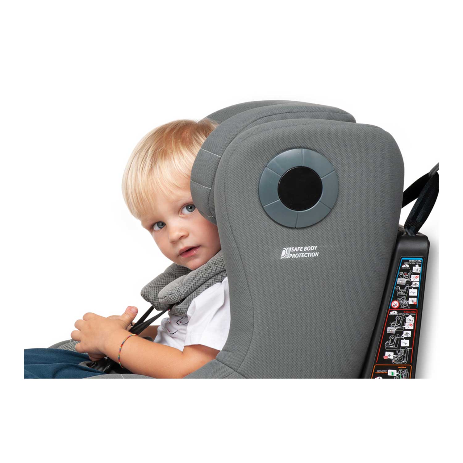- Tessuti ed imbottiture sono extra comfort, poggiatesta e cinture si regolano simultaneamente a più altezza con meccanismo a una mano, test di impatto laterale e ulteriore protezione per la sicurezza da 100 cm di altezza con il “comfort kid pad”.