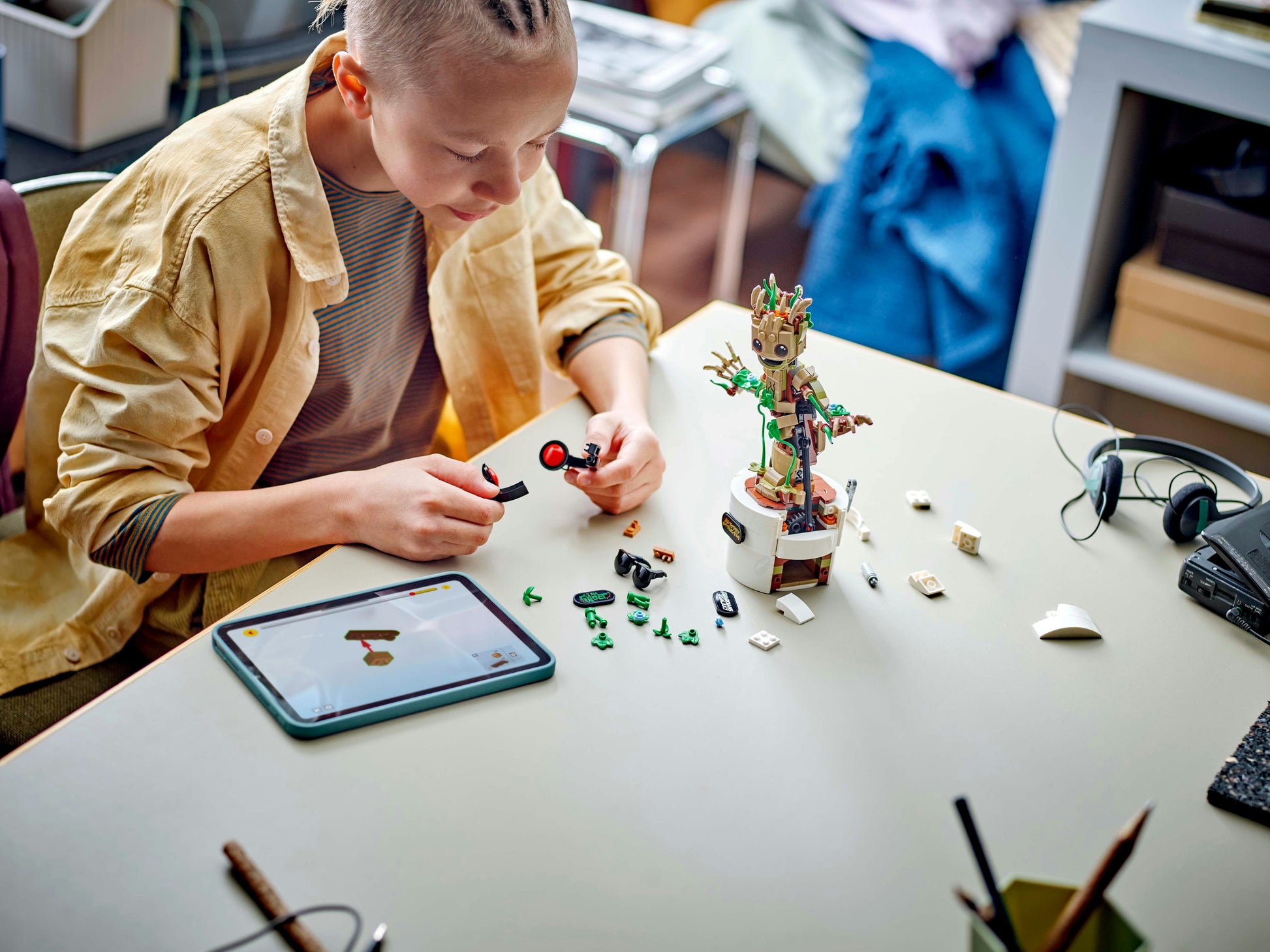 Questo giocattolo costruibile di Groot per bambini è dotato di testa mobile e braccia snodabili. Quando i bambini girano la maniglia sul retro del vaso da fiori, Groot snodabile inizia a ballare. La figura può essere personalizzata con foglie aggiuntive, cuffie e occhiali da sole costruibili, e i bambini possono personalizzare anche il vaso di Groot aggiungendo sul davanti 1 delle 3 diverse targhette (inclusa una relativa allo show televisivo I am Groot). Tutti questi accessori possono essere riposti nello scomparto integrato del vaso. Per rendere la costruzione del modello ancora più divertente, l’app LEGO Builder consente ai bambini di ingrandire, ruotare i modelli in 3D e monitorare i progressi mentre procedono.