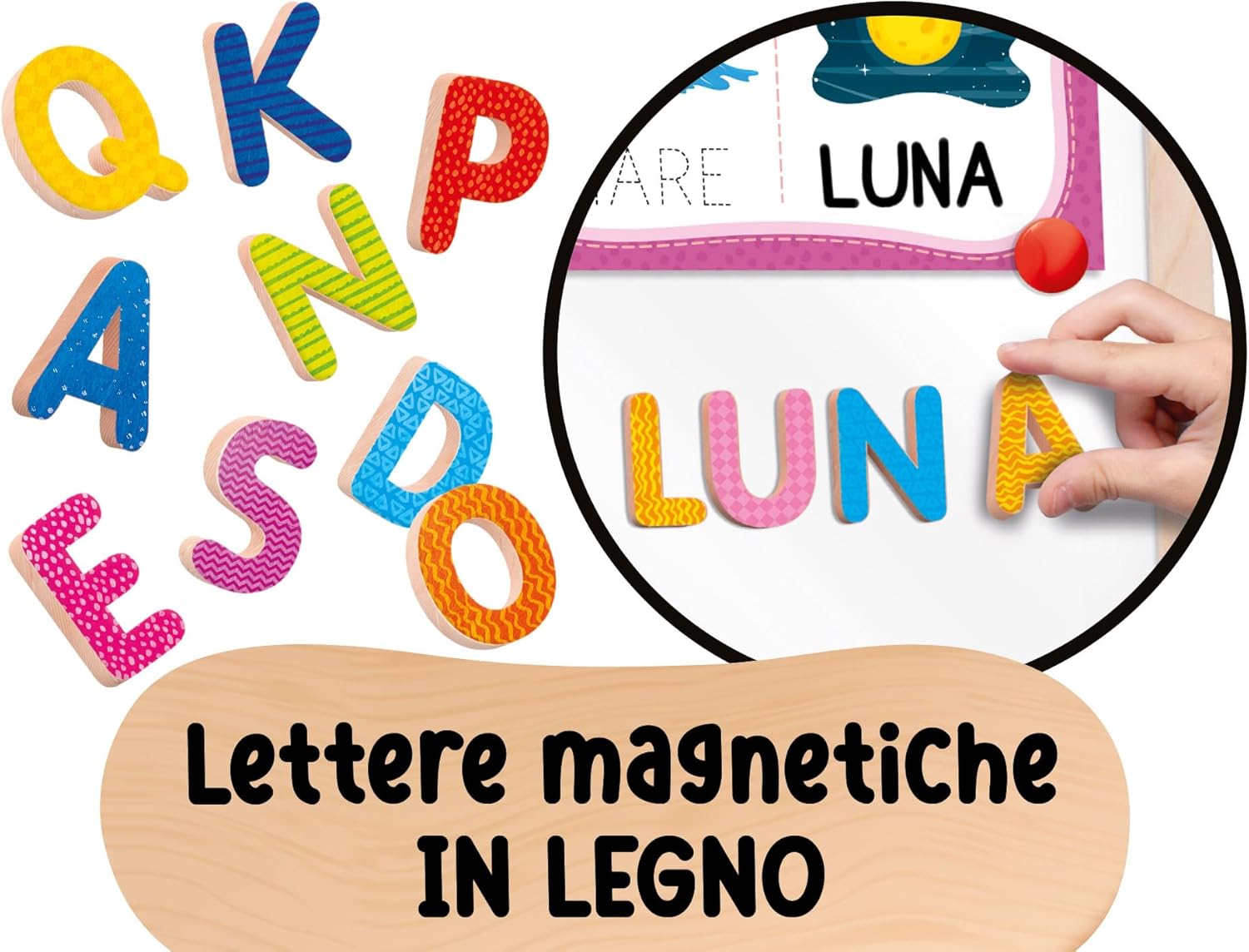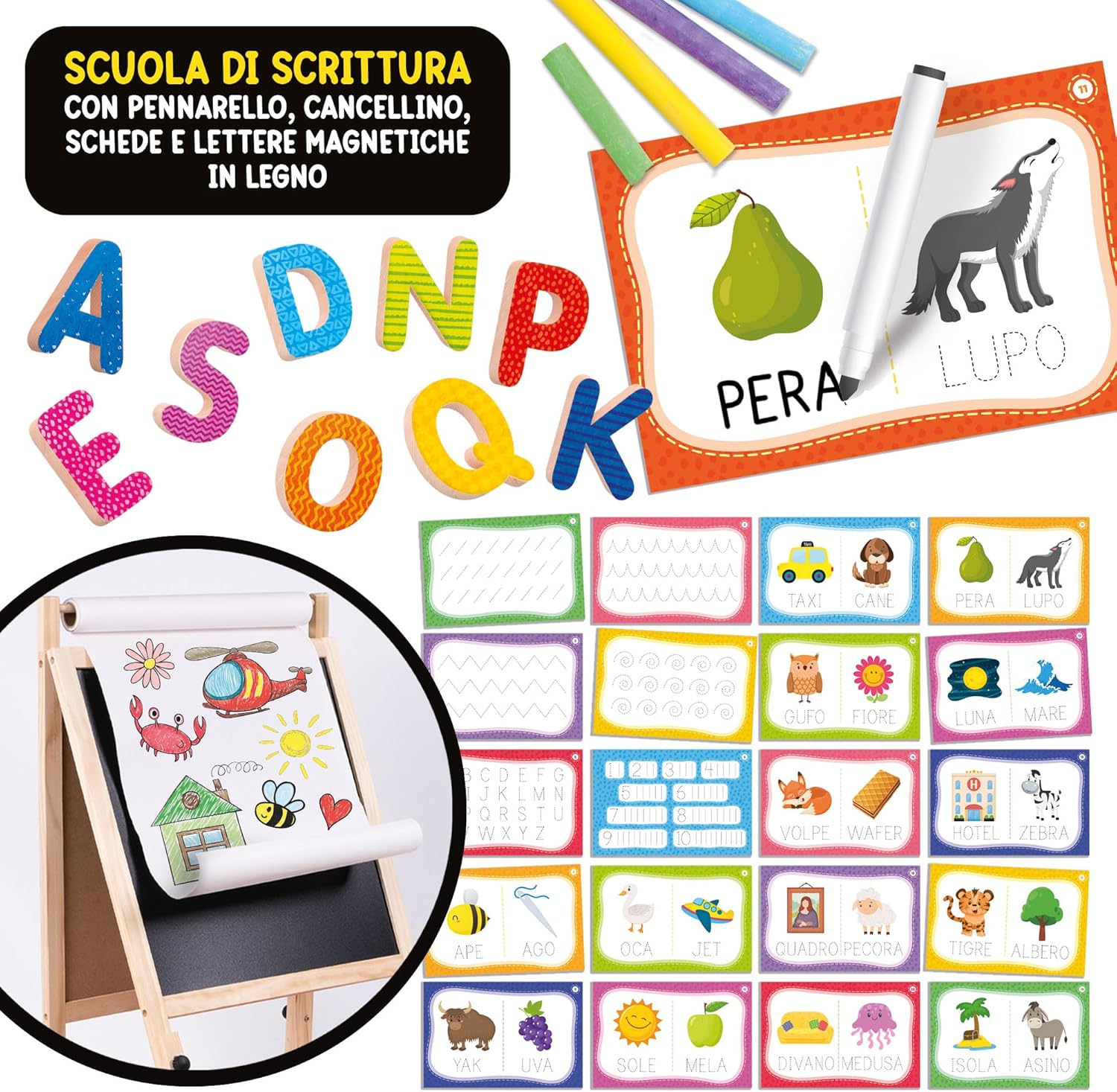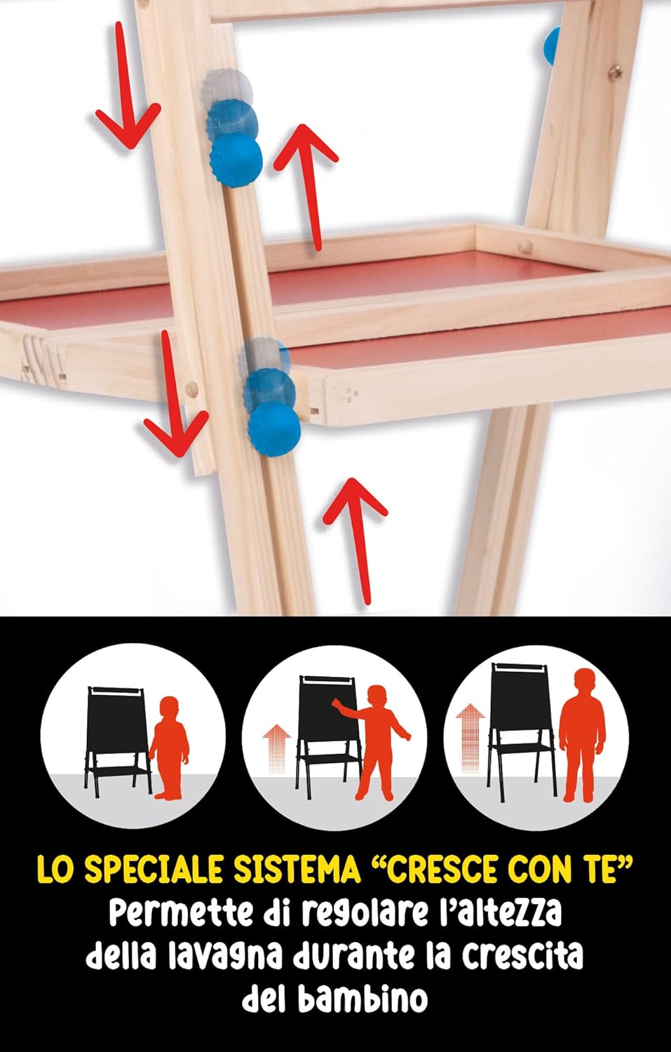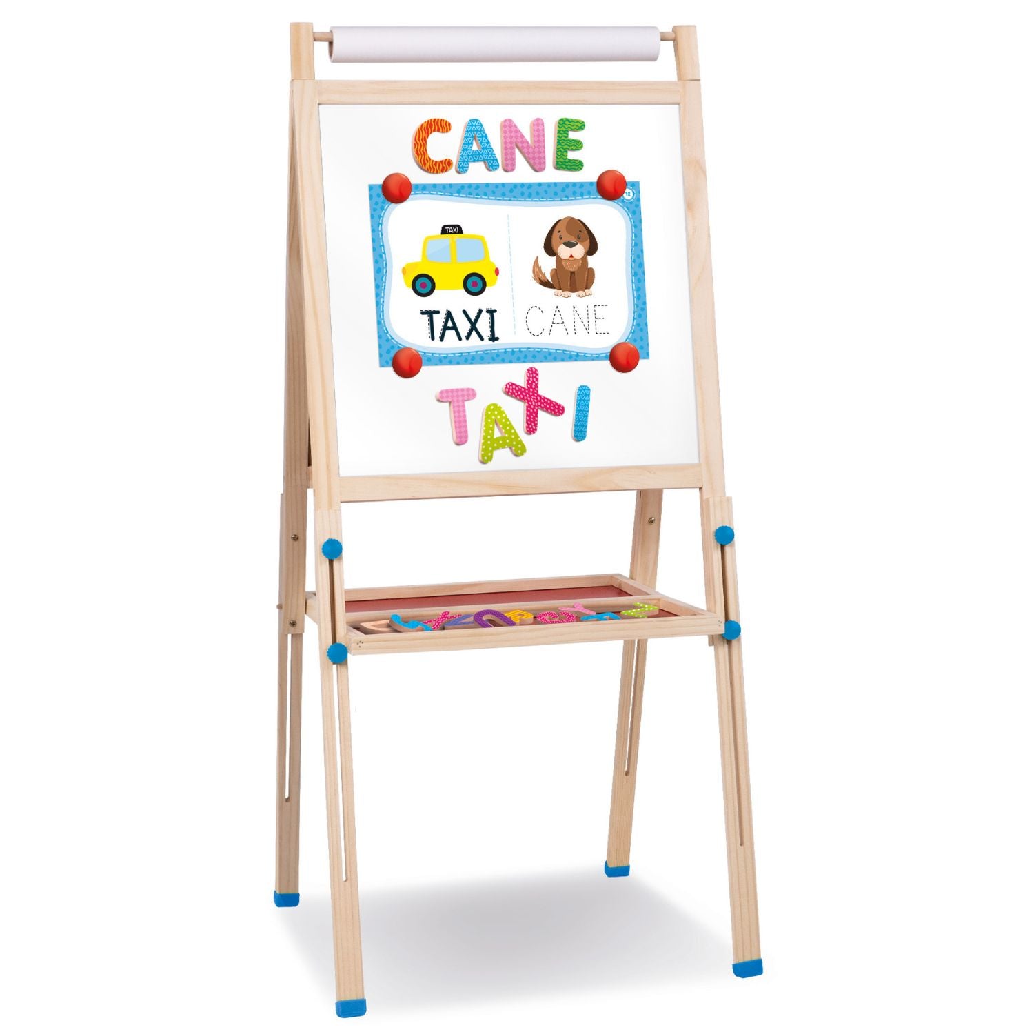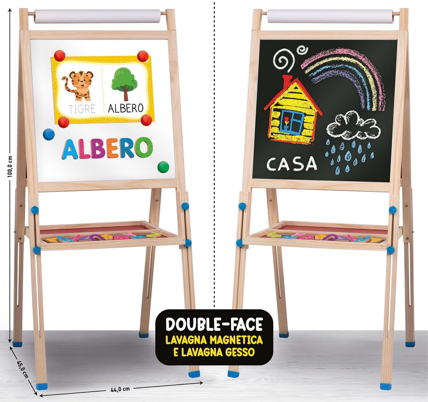 Una maxi lavagna da terra con altezza regolabile che si adatta alla crescita del bambino. Realizzata in legno di alta qualità, si compone di due lati: lavagna tradizionale con gessetti e lavagna magnetica con lettere in legno e penna scrivi e cancella. In più, un ricco kit di giochi educativi incluso.