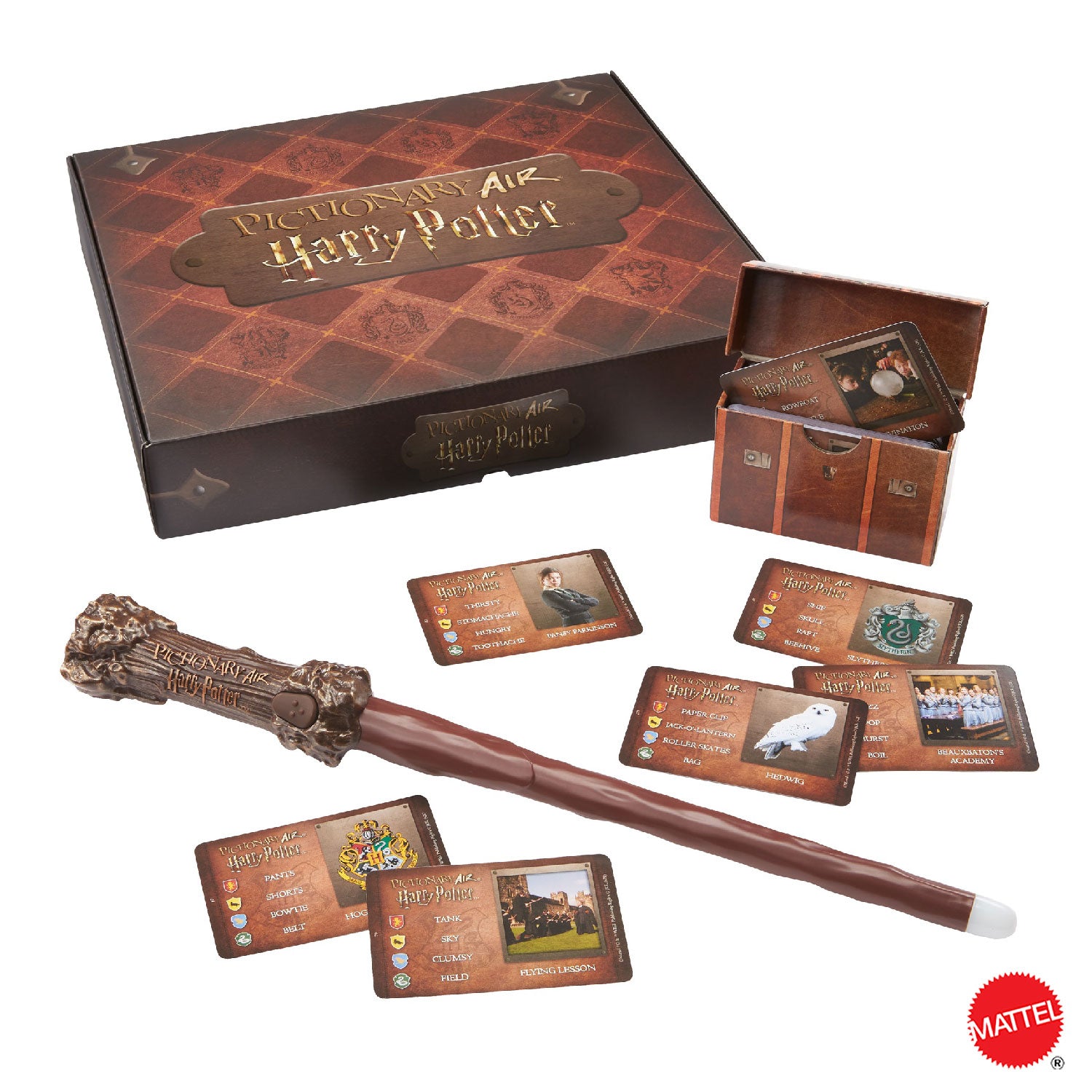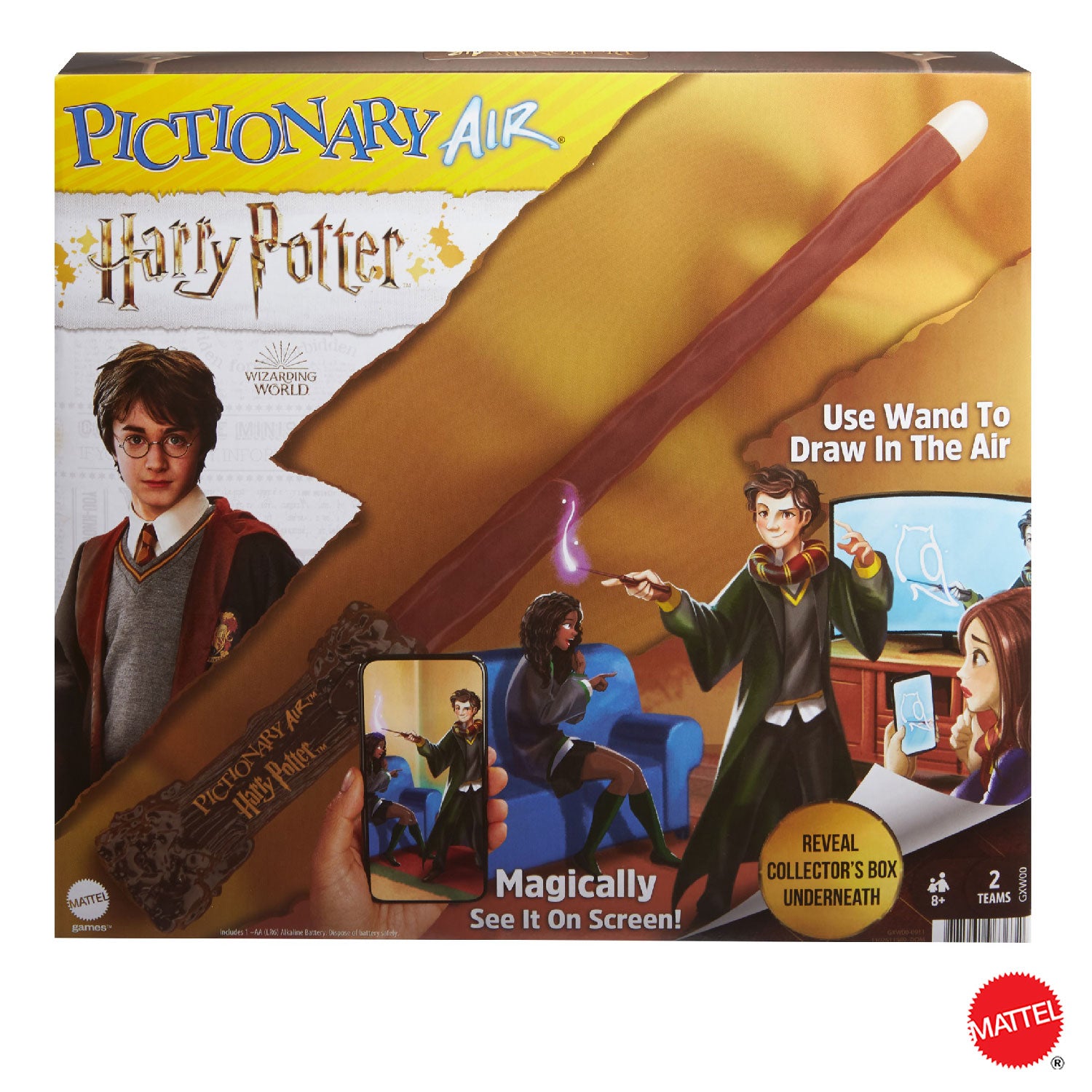 Apri il pack da collezione e troverai una penna Pictionary Air a forma della famosa bacchetta di Harry Potter, un porta carte ispirato al baule di Harry e 112 carte double-face con parole da indovinare, dotate di indizi che richiamano il magico mondo di Hogwarts. Scarica l'app gratuita Pictionary Air sul tuo smartphone o tablet per iniziare (potrebbero essere applicati costi per la trasmissione dati). Per giocare, sono necessari un dispositivo smart iOS o Android e l'app.
