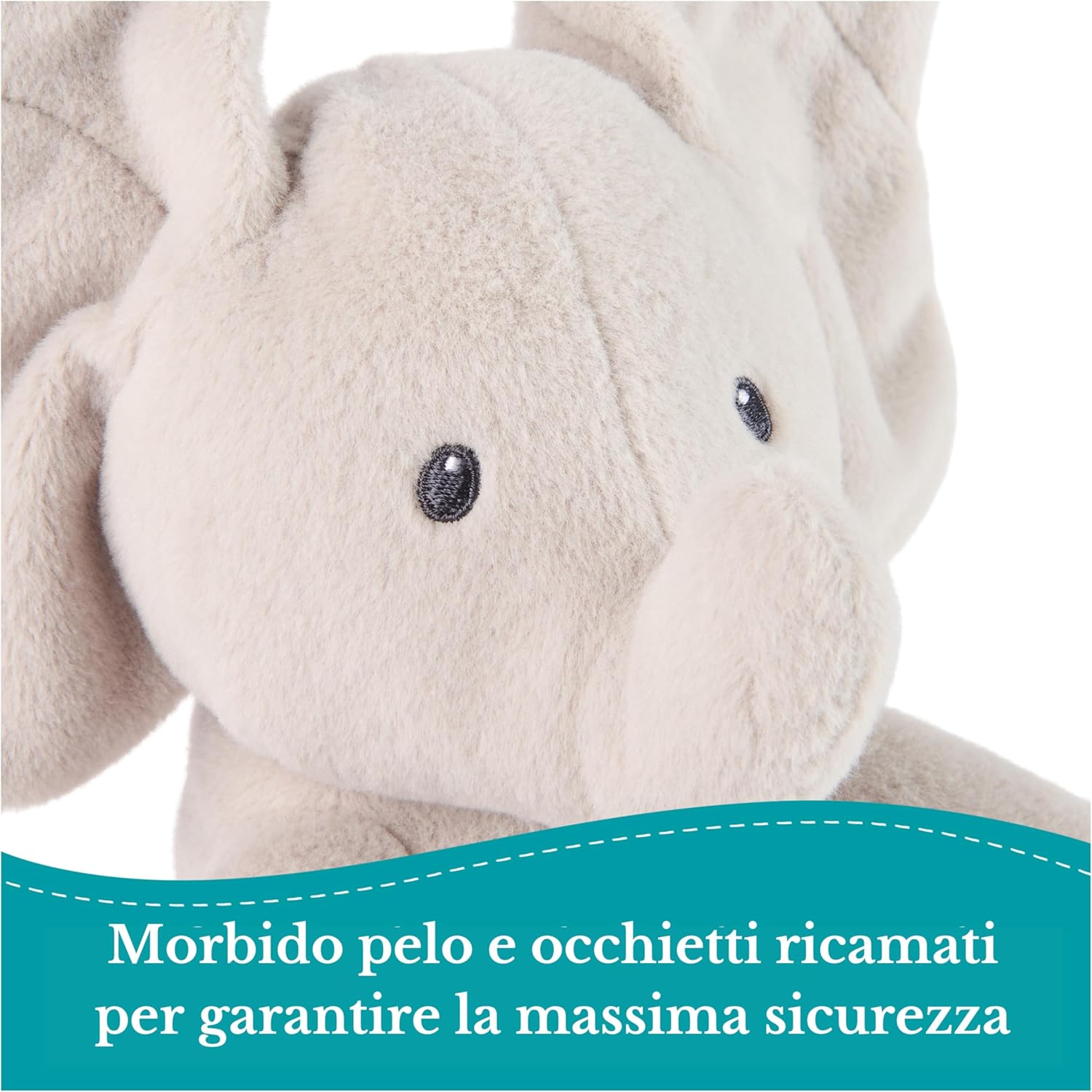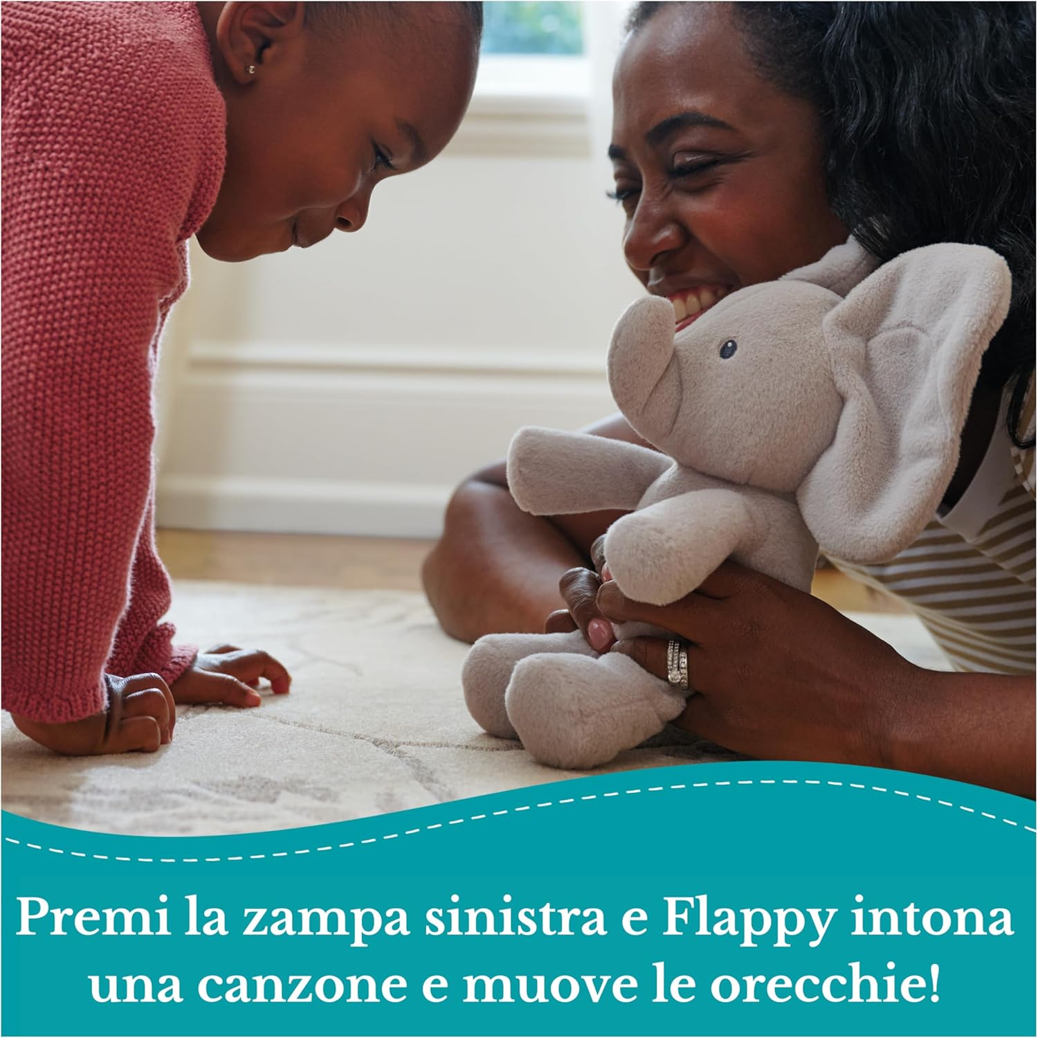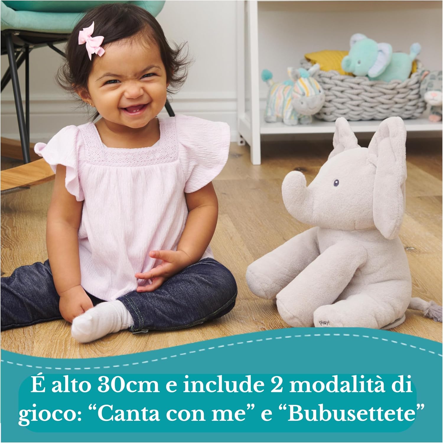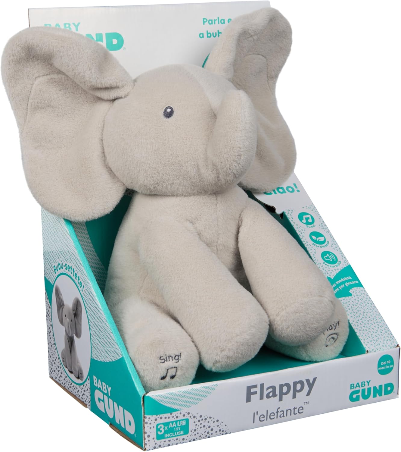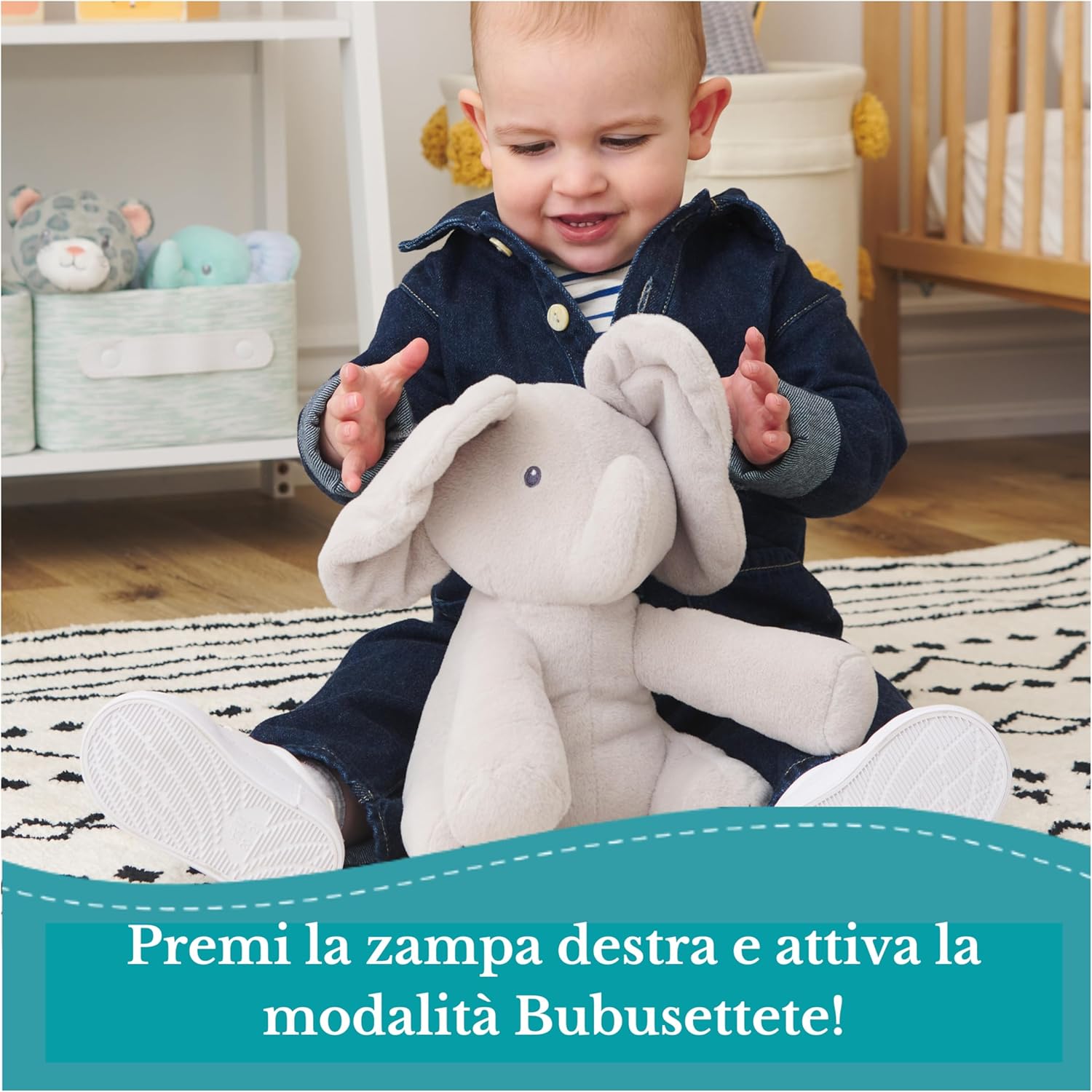 Flappy l'elefantino peluche interattivo è un vero amico di gioco per i piccoli da 10 mesi in su. In morbidissimo pelo corto di alta qualità, ha due grandi orecchie e occhi ricamati per garantire la totale sicurezza. Premendo una delle due zampe si attivà la modalità di gioco bubusette tanto amata di piccolini. Grazie al movimento su e giù delle morbide orecchie sugli occhi, flappy gioca a bubusette cercando il bimbo e instaurando una vera interazione. Premendo l'altra zampa flappy canta un'allegra canzoncina muovendo le orecchie al ritmo della melodia che può essere anche una dolce ninna nanna.
