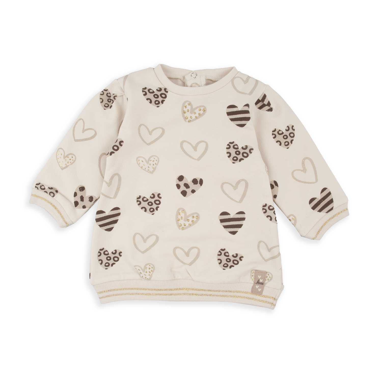 Deliziosa felpa in cotone elasticizzato per bambina, perfetta per la stagione autunnale e primaverile. La base color panna è decorata con una vivace fantasia di cuori in vari stili: a righe, animalier, con glitter dorati e contorni delicati. Il capo unisce stile e comfort, rendendolo ideale per tutti i giorni o per occasioni speciali.